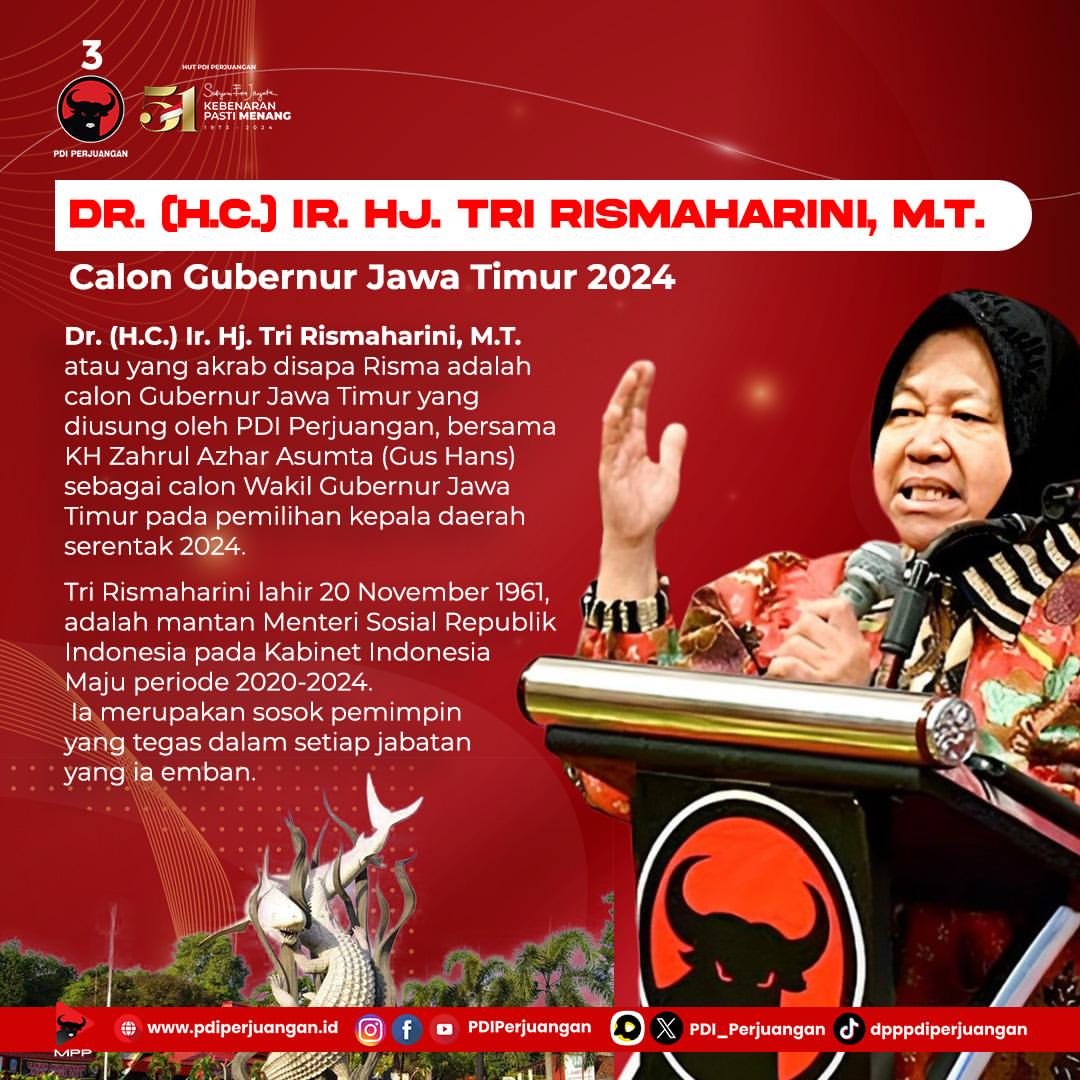 Dr. (H.C.) Ir. Hj. Tri Rismaharini, M.T., yang akrab disapa Risma, telah diumumkan sebagai calon Gubernur Jawa Timur oleh PDI Perjuangan. Bersama KH Zahrul Azhar Asumta, yang lebih dikenal sebagai Gus Hans, Risma akan maju sebagai pasangan calon di pemilihan kepala daerah serentak yang akan berlangsung pada tahun 2024.