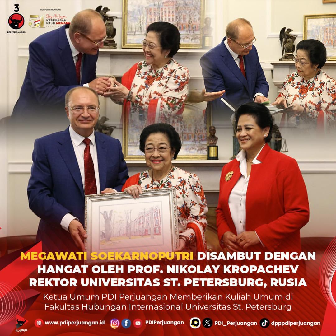 St. Petersburg, Rusia – Pada hari Senin, 16 September 2024, Megawati Soekarnoputri, yang merupakan Presiden Kelima Republik Indonesia dan juga Ketua Umum DPP PDI Perjuangan, memulai kunjungannya ke Rusia. Kunjungan ini diawali dengan pertemuan dan ramah tamah bersama Prof. Nikolay Kropachev, Rektor Universitas St. Petersburg, di kantor Rektor universitas tersebut.
