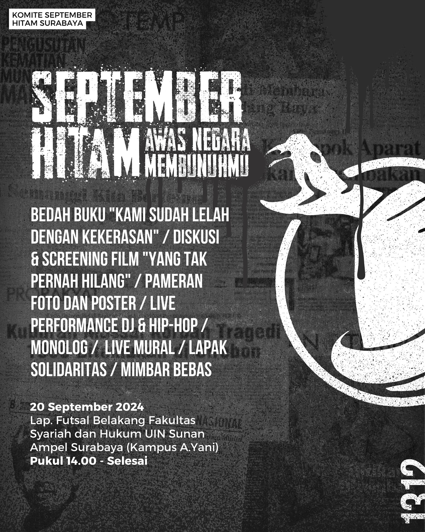 Komite September Hitam Surabaya mengadakan acara untuk memperingati bulan September yang menjadi simbol penindasan dan kekerasan oleh negara. Acara ini akan dilaksanakan pada hari Jumat, 20 September 2024, pukul 14.00 WIB di Lapangan Futsal Fakultas Syariah dan Hukum UINSA, Kampus A. Yani.