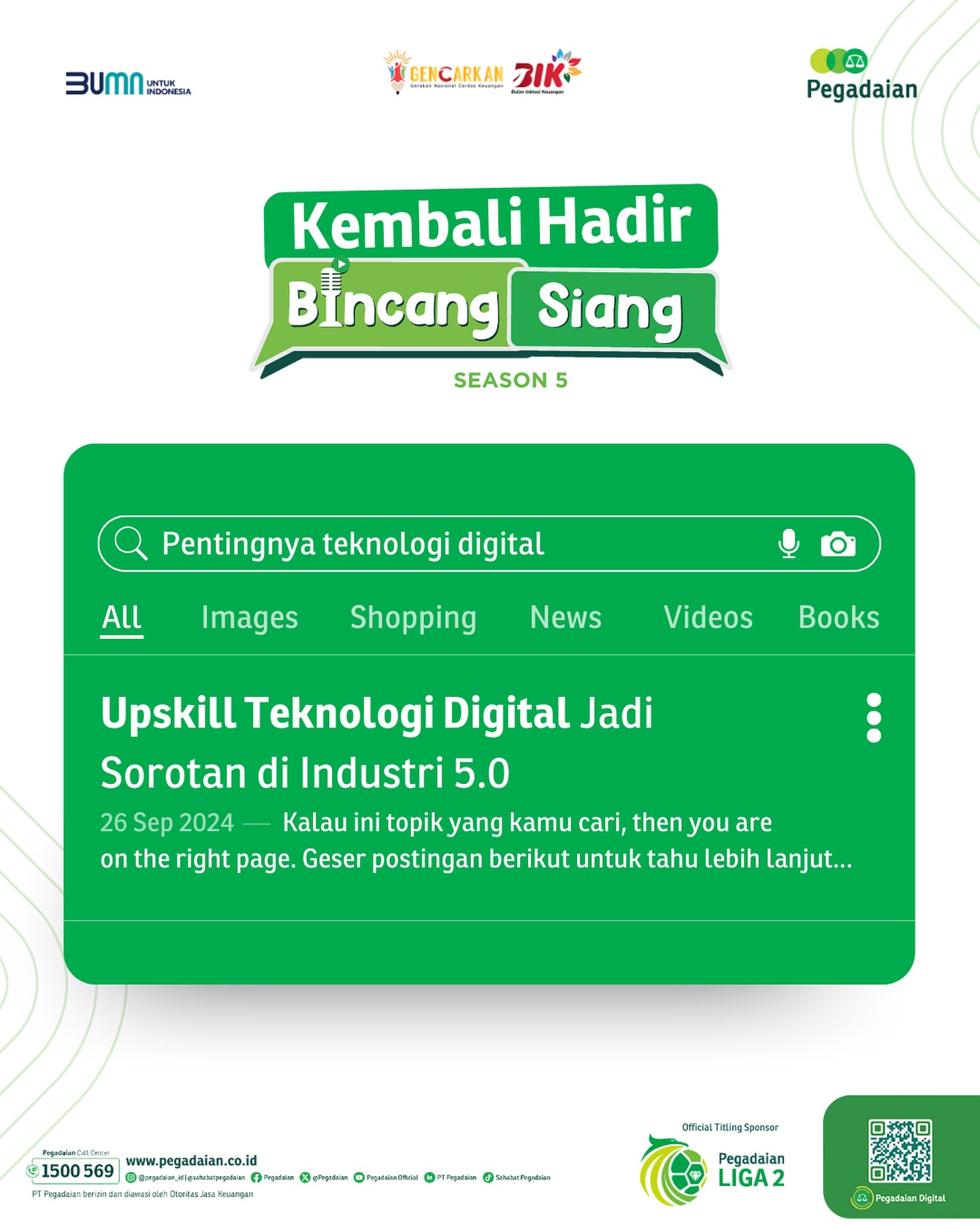 Bincang Siang kembali hadir dengan topik menarik mengenai teknologi digital dan perannya dalam kehidupan sehari-hari. Acara ini akan diadakan pada Kamis, 26 September 2024, mulai pukul 14.00 WIB hingga 15.30 WIB.