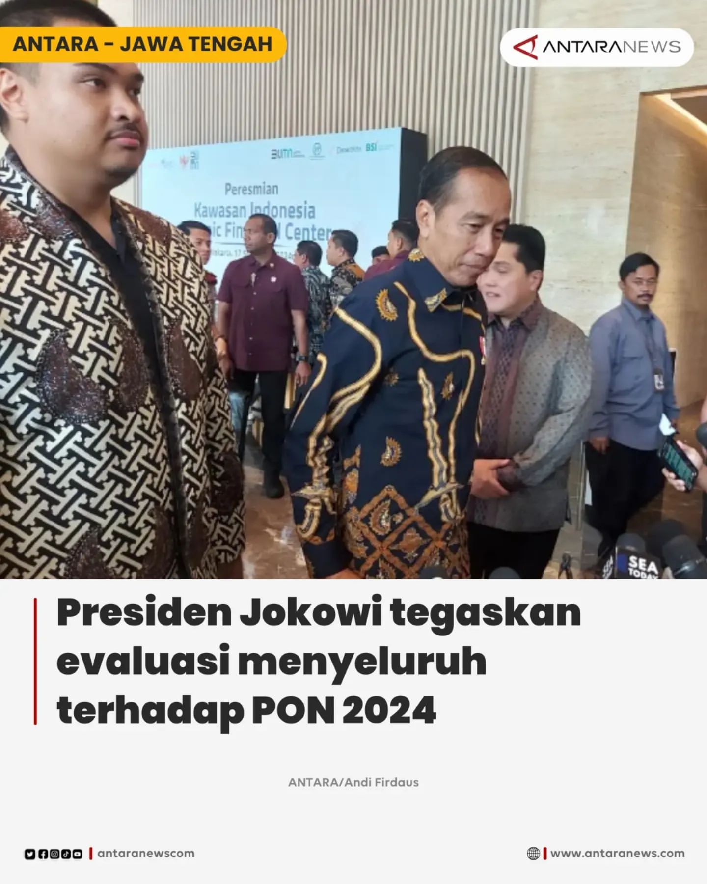 Jakarta (ANTARA) - Presiden Joko Widodo (Jokowi) menegaskan bahwa akan dilakukan evaluasi menyeluruh terhadap penyelenggaraan Pekan Olahraga Nasional (PON) yang akan berlangsung pada tahun 2024 di Aceh dan Sumatera Utara. Hal ini disampaikan oleh Presiden Jokowi untuk menangani berbagai kendala yang muncul, terutama terkait dengan keterlambatan pembangunan atau renovasi venue olahraga.