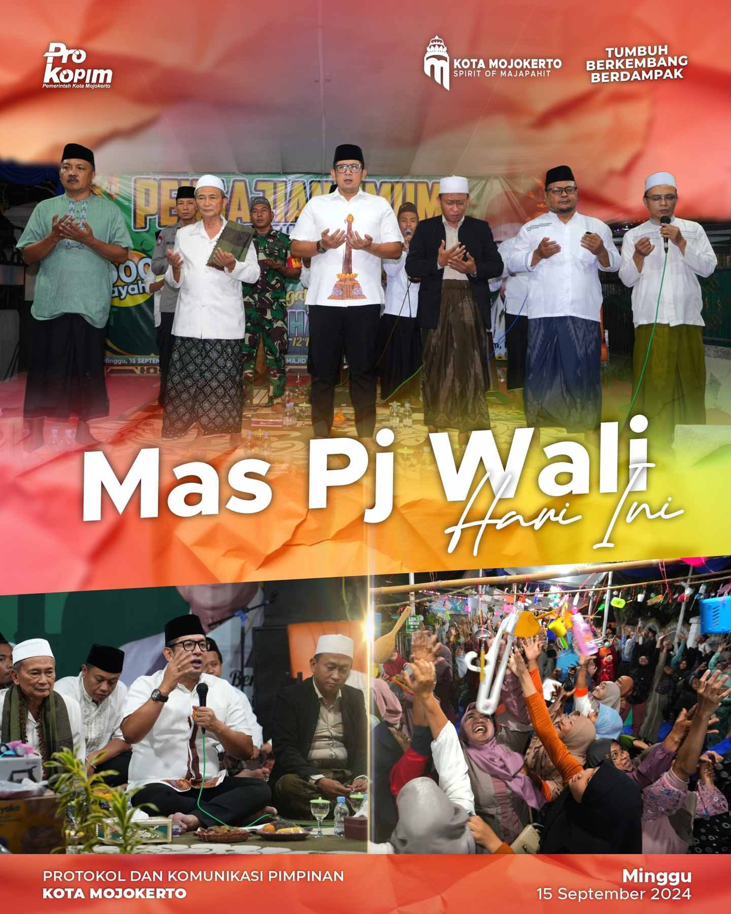Mojokerto, 15 September 2024 - Penjabat Wali Kota Mojokerto, Moh. Ali Kuncoro, menghadiri acara Pengajian Umum dan Grebeg Maulid 1.000 Layah yang diselenggarakan dalam rangka memperingati Maulid Nabi Muhammad SAW. Acara ini berlangsung di Langgar Wakaf "Abdul Madjid Rahman" yang terletak di Jl. Trunojoyo No. 30, Kelurahan Magersari, Kecamatan Magersari, Kota Mojokerto.