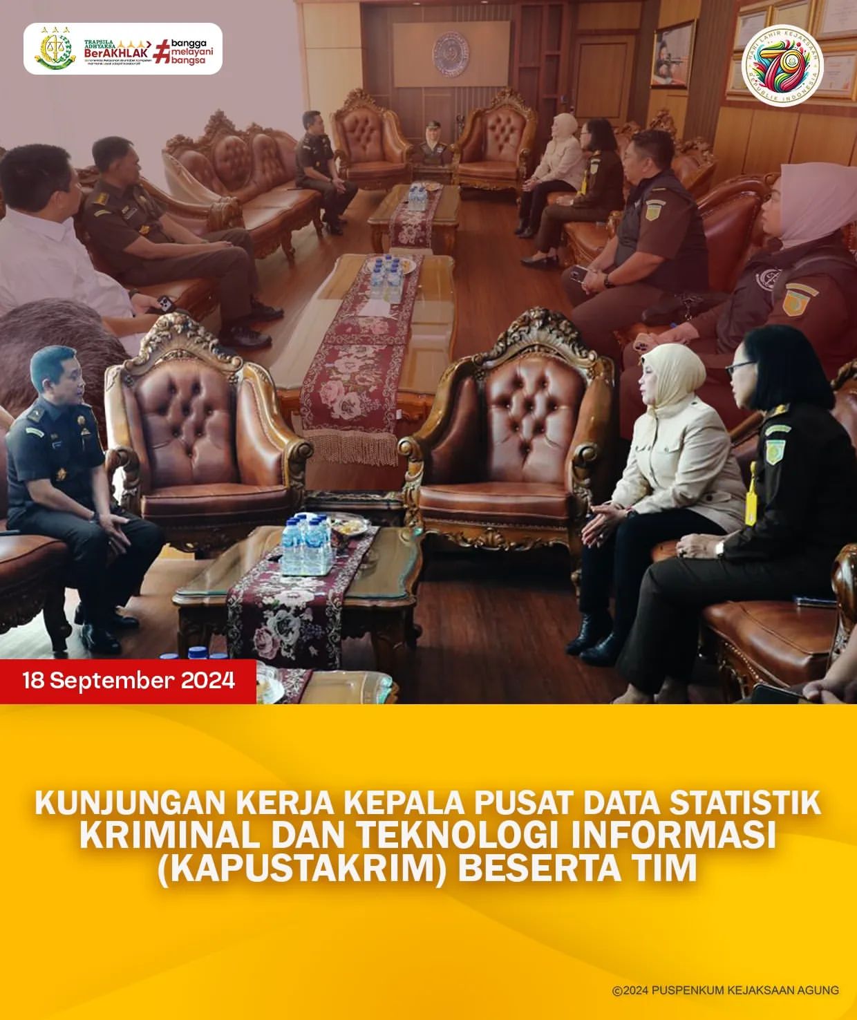 Pada hari Rabu, 18 September 2024, Kepala Pusat Data Statistik Kriminal dan Teknologi Informasi (Kapustakrim) Roch Adi Wibowo, S.H., M.H., beserta tim melakukan kunjungan kerja ke Kejaksaan Tinggi Jawa Timur (Kejati Jatim). Dalam kunjungan ini, Kapustakrim diterima oleh Kepala Kejati Jatim, Dr. Mia Amiati, S.H., M.H., CMA, CSSL, serta Asisten Bidang Pembinaan (Asbin) dan Asisten Bidang Perdata dan Tata Usaha Negara (Asdatun).