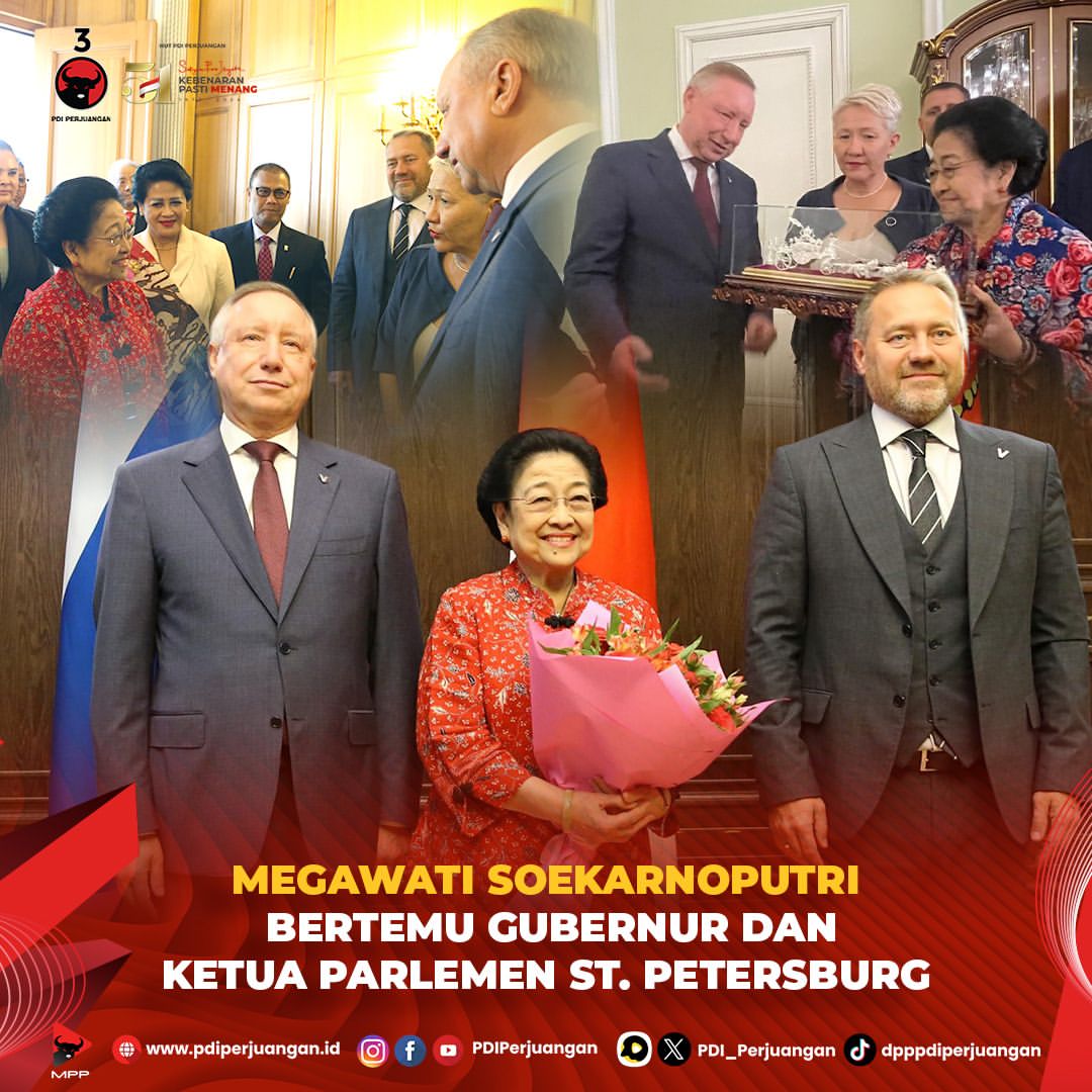 Pada hari Selasa, 17 September 2024, Presiden kelima Indonesia, Megawati Soekarnoputri, mengadakan pertemuan dengan Gubernur St. Petersburg, Alexander Beglov, dan Ketua Parlemen St. Petersburg, Alexander Belsky. Pertemuan ini berlangsung di Kantor Gubernur St. Petersburg, Rusia.