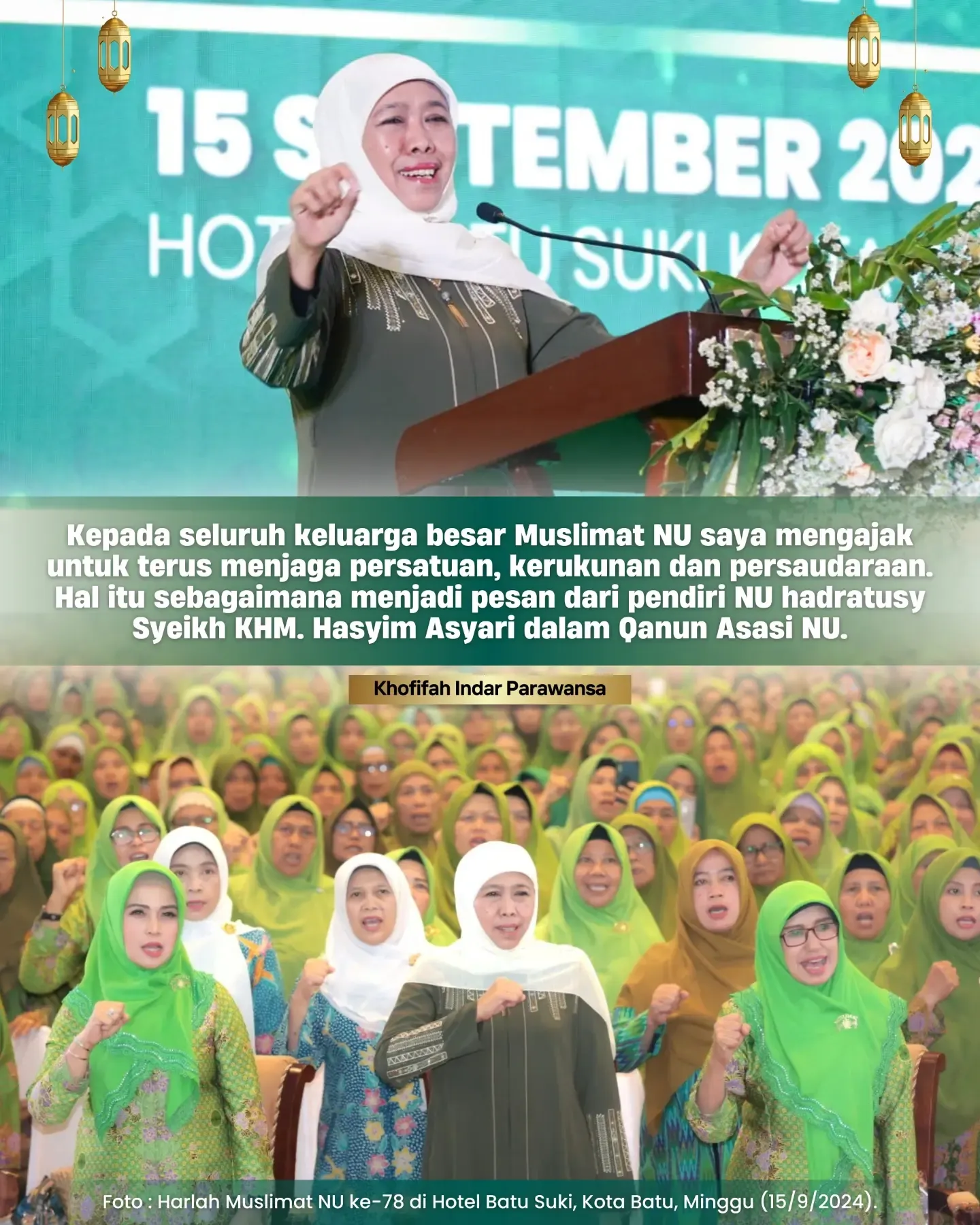 Ketua Muslimat NU, Khofifah Indar Parawansa, dalam sambutannya mengajak seluruh keluarga besar Muslimat NU untuk terus menjaga persatuan, kerukunan, dan persaudaraan. Pesan ini diambil dari ajaran pendiri NU, Hadratusy Syech KHM. Hasyim Asyari, yang mengingatkan pentingnya nilai-nilai tersebut dalam Qanun Asasi NU.