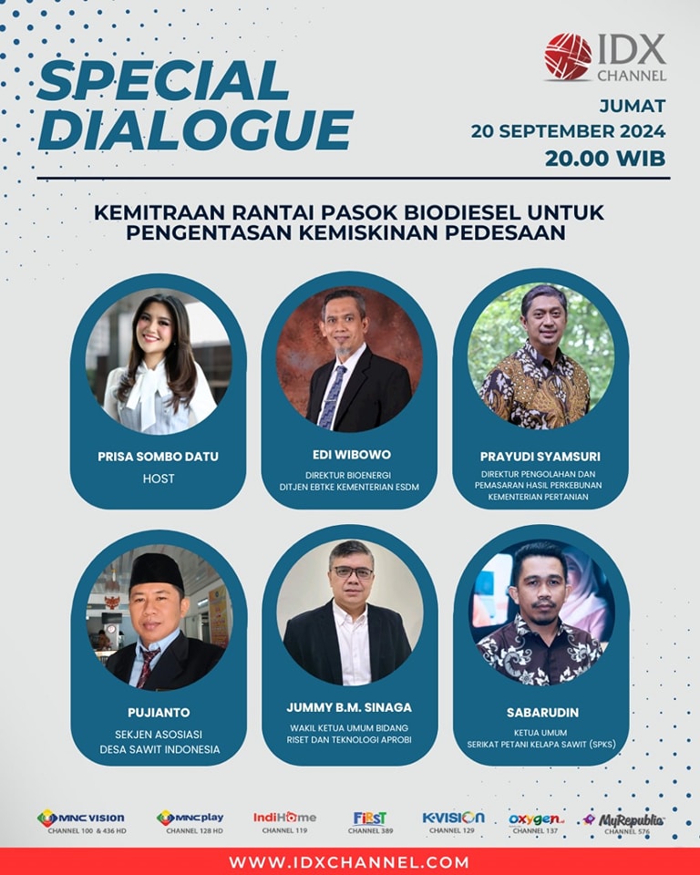 Untuk menggali lebih dalam mengenai peran industri sawit di Indonesia, akan diadakan acara Special Dialogue di IDX Channel pada hari Jumat, 20 September 2024, pukul 20.00 WIB. Acara ini akan menghadirkan narasumber yang kompeten seperti Direktur Bioenergi Ditjen EBTKE Kementerian ESDM, Edi Wibowo; Direktur Pengolahan dan Pemasaran Hasil Perkebunan Kementerian Pertanian, Prayudi Syamsuri; Sekjen Asosiasi Desa Sawit Indonesia, Pujianto; Wakil Ketua Umum Bidang Riset dan Teknologi Aprobi, Jummy BM Sinaga; dan Ketua Umum Serikat Petani Kelapa Sawit (SPKS), Sabarudin. Acara tersebut akan dipandu oleh Prisa Sombo Datu.