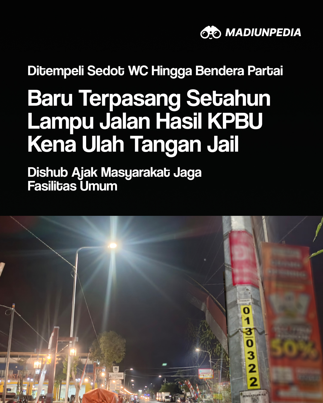 MADIUN – Dinas Perhubungan Kabupaten Madiun mengingatkan kepada seluruh warga untuk menjaga dan merawat fasilitas Lampu Penerangan Jalan Umum (KPBU) yang ada di wilayah mereka. Dalam sebuah pengumuman, pihak Dinas menyatakan bahwa penting untuk tidak hanya mengandalkan pihak pemerintah dalam menjaga fasilitas publik ini.