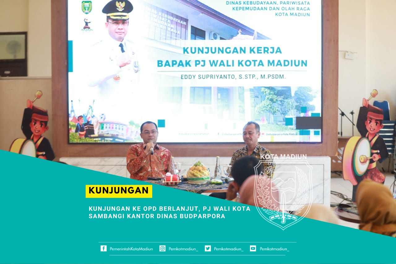 MADIUN – Kegiatan kunjungan Pj Wali Kota Madiun, Eddy Supriyanto, ke kantor organisasi perangkat daerah (OPD) terus berlanjut. Kali ini, pada hari Kamis, 19 September, Pj Wali Kota mengunjungi Dinas Kebudayaan, Pariwisata, Pemuda, dan Olahraga (Budparpora) Kota Madiun.