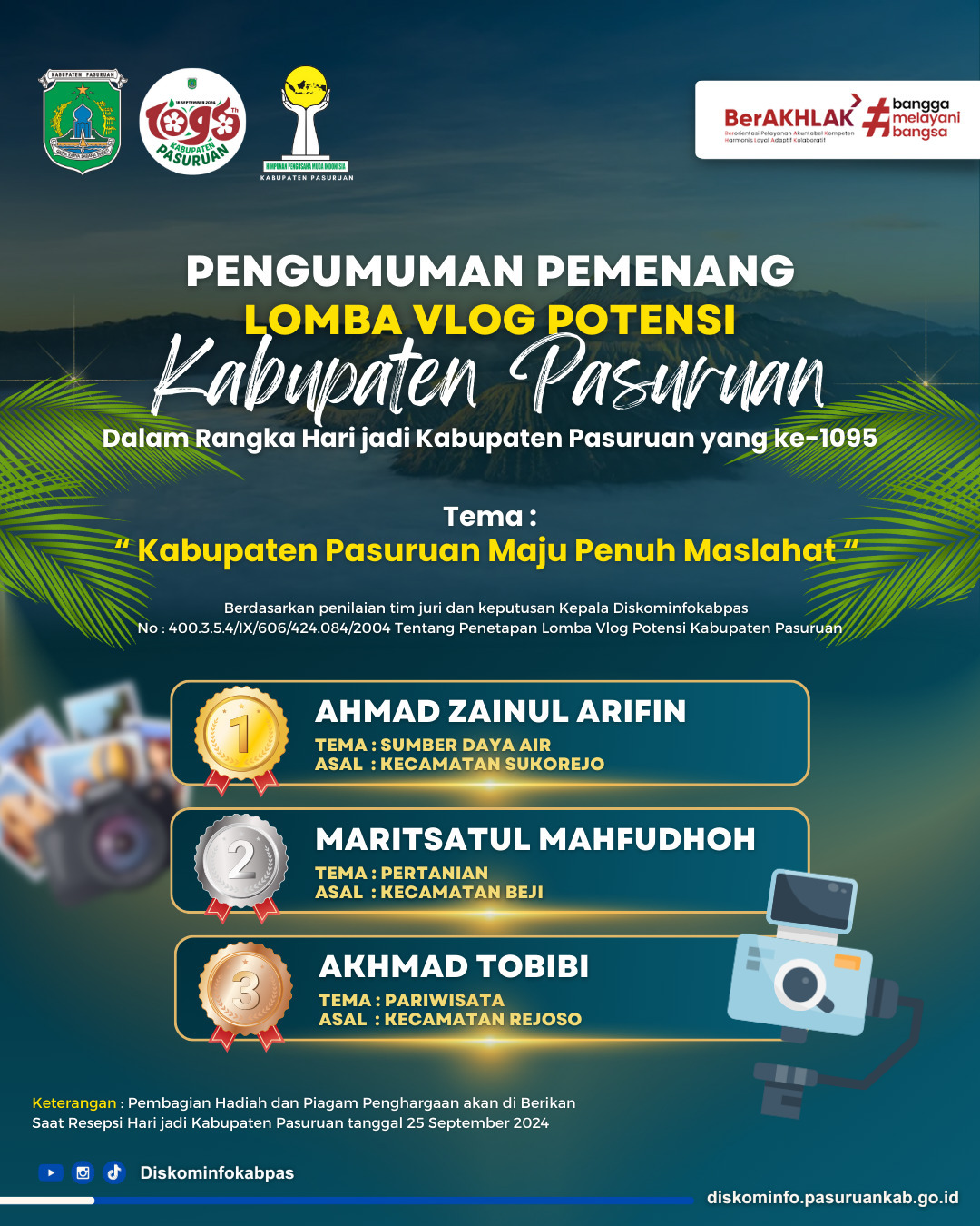 Setelah penilaian yang ketat, tiga pemenang berhasil terpilih. Pemenang pertama adalah @Fordaskabpasuruan, diikuti oleh @ritsaa_ sebagai juara kedua, dan @tobi.id yang meraih juara ketiga. Karya-karya mereka telah menunjukkan semangat dan kreativitas yang luar biasa dalam mempromosikan daerah mereka.