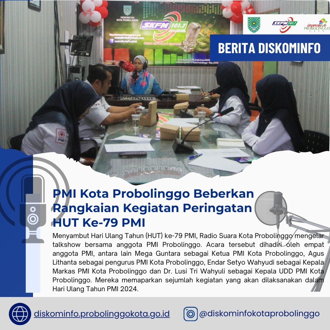 PROBOLINGGO – Palang Merah Indonesia (PMI) Kota Probolinggo akan merayakan Hari Ulang Tahun (HUT) yang ke-79 pada bulan September 2024. Persiapan untuk perayaan ini telah dibahas dalam sebuah talkshow yang digelar oleh Radio Suara Kota Probolinggo.