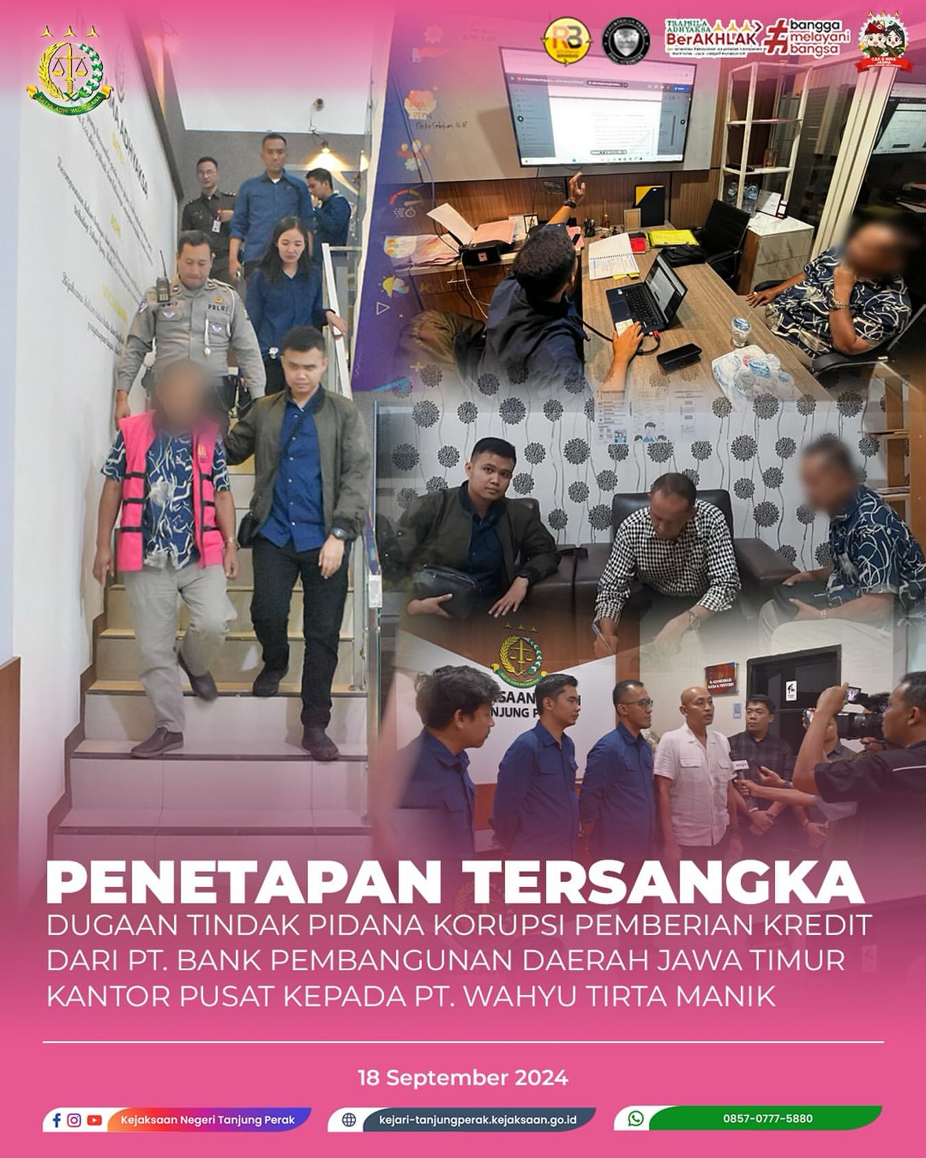 SURABAYA, 18 September 2024 – Tim Jaksa Penyidik dari Seksi Tindak Pidana Khusus Kejaksaan Negeri Tanjung Perak telah melakukan penahanan terhadap seorang tersangka dalam kasus dugaan tindak pidana korupsi. Penahanan ini berkaitan dengan pemberian kredit dari PT. Bank Pembangunan Daerah Jawa Timur (Bank Jatim) kepada PT. Wahyu Tirta Manik.