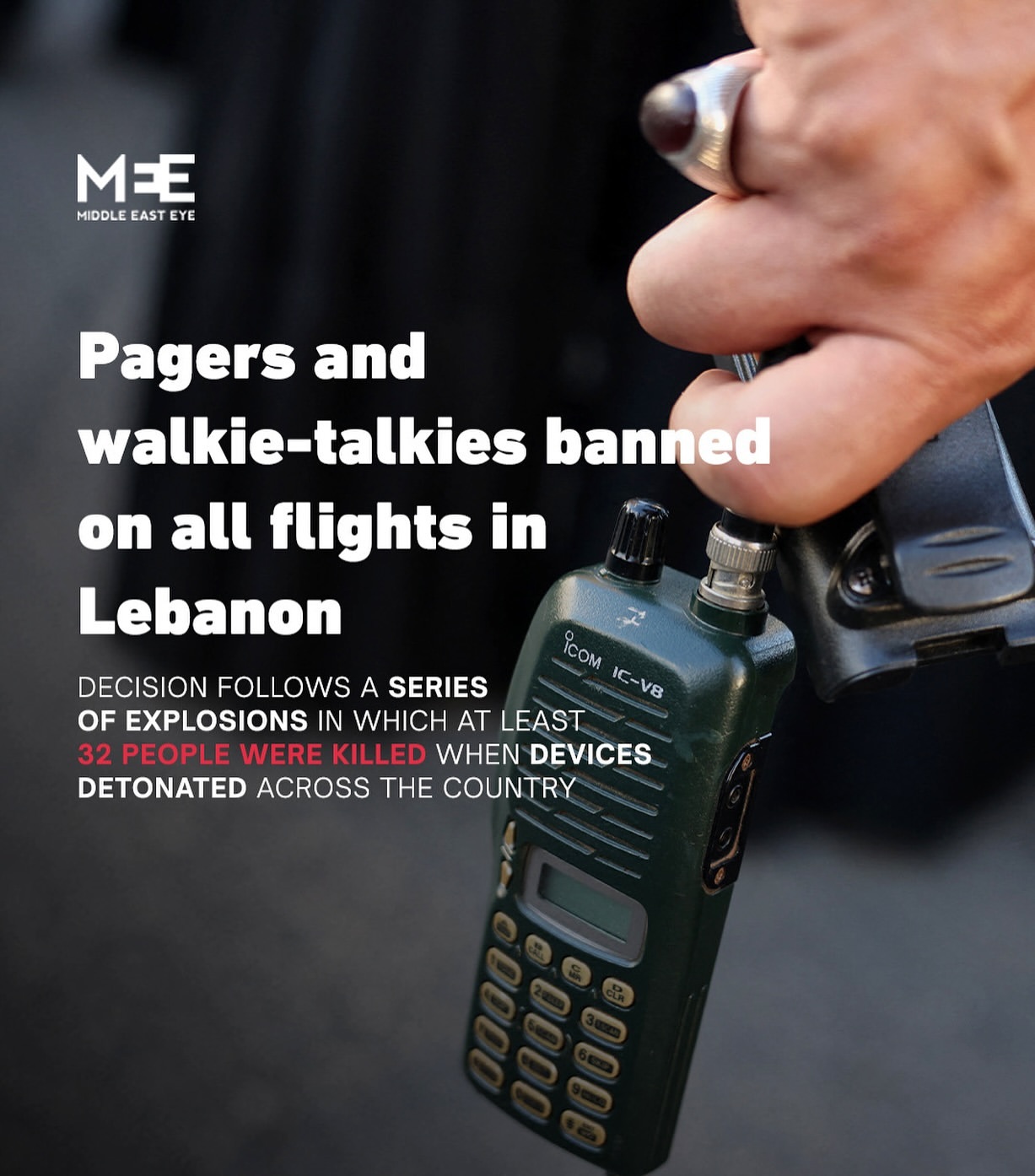 Aturan ini berlaku segera dan akan tetap diterapkan hingga pemberitahuan lebih lanjut. Keputusan ini diambil menyusul serangkaian ledakan yang terjadi di seluruh Lebanon pada hari Selasa dan Rabu, yang mengakibatkan kematian setidaknya 32 orang. Dalam insiden tersebut, ribuan perangkat seperti pager, walkie-talkie, ponsel, laptop, dan sel surya meledak.