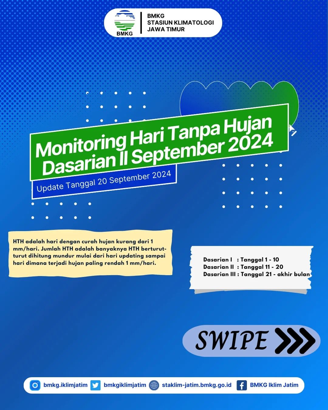 Dalam periode sepuluh hari terakhir, yaitu dari 11 hingga 20 September 2024, BMKG telah mengamati Hari Tanpa Hujan (HTH) yang beragam di berbagai wilayah. Beberapa tempat mengalami kekurangan curah hujan yang cukup parah, sehingga berpotensi menimbulkan dampak negatif bagi lingkungan dan pertanian.