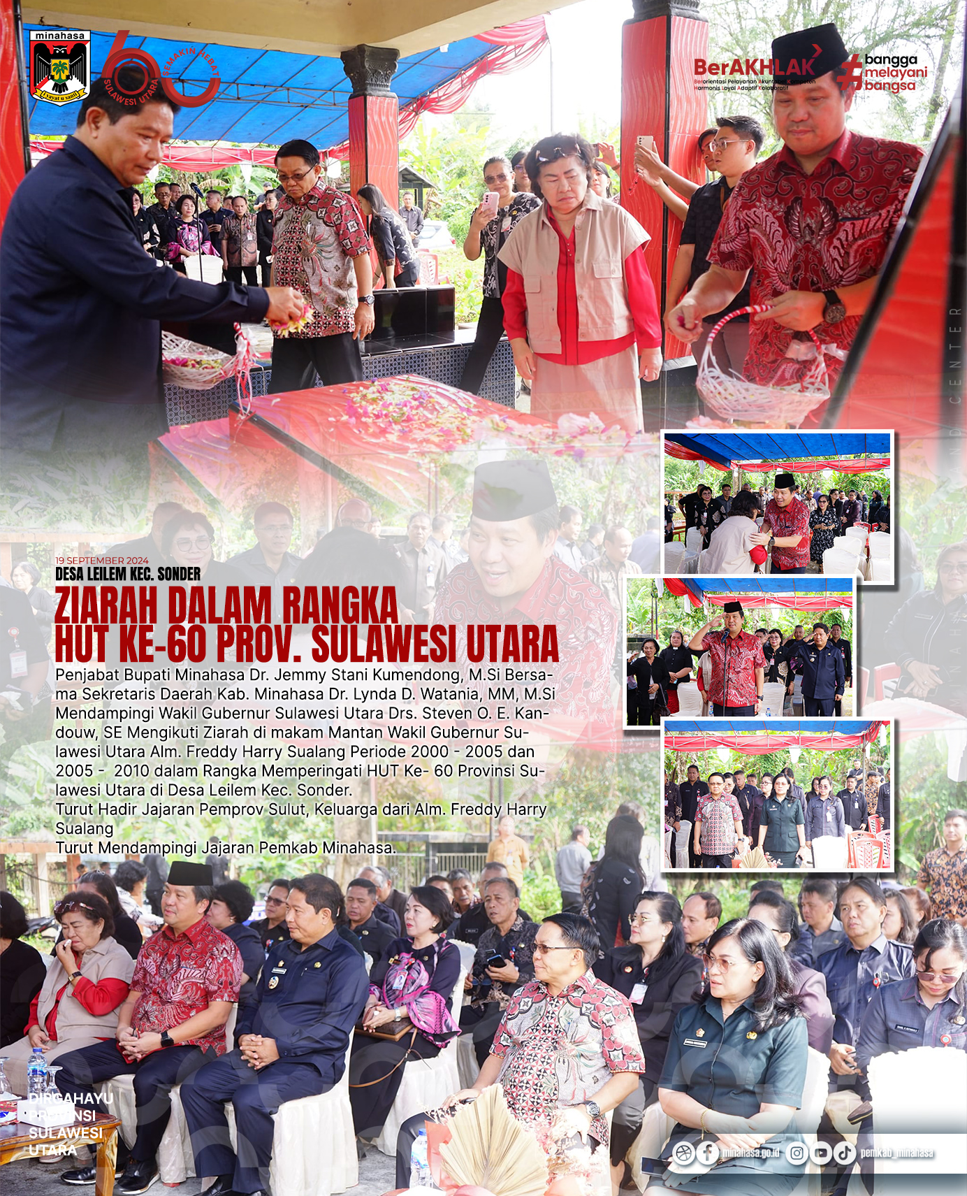 Minahasa, Sulawesi Utara - Penjabat Bupati Minahasa, Dr. Jemmy Stani Kumendong, M.Si dan Sekretaris Daerah Kabupaten Minahasa, Dr. Lynda D. Watania, MM, M.Si, turut menghadiri ziarah di makam mantan Wakil Gubernur Sulawesi Utara, Almarhum Freddy Harry Sualang. Acara ini dilaksanakan dalam rangka memperingati Hari Ulang Tahun (HUT) ke-60 Provinsi Sulawesi Utara.