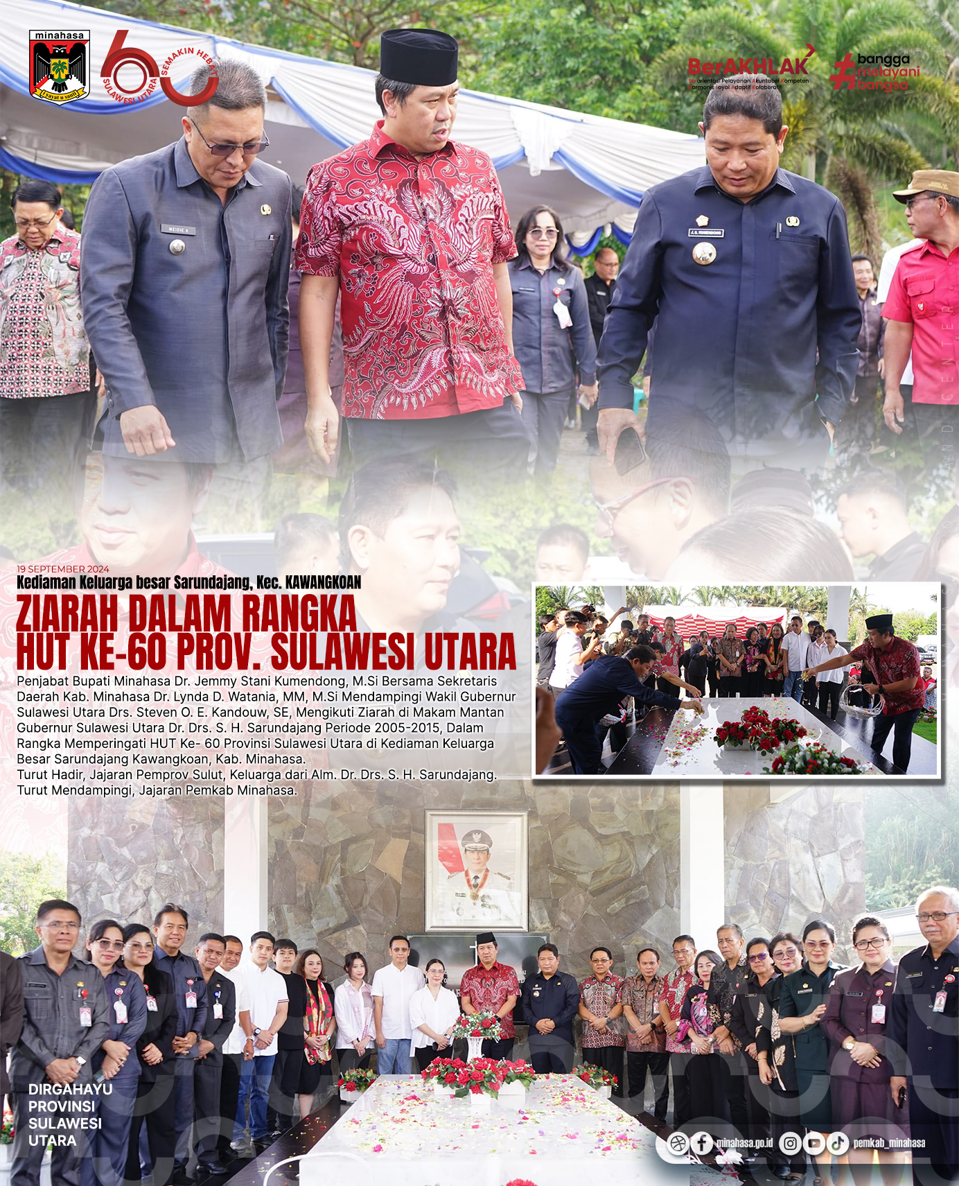 Pada tanggal yang bersejarah ini, Penjabat Bupati Minahasa, Dr. Jemmy Stani Kumendong, M.Si, bersama Sekretaris Daerah Kabupaten Minahasa, Dr. Lynda D. Watania, MM, M.Si, melakukan ziarah ke makam mantan Gubernur Sulawesi Utara, Dr. Drs. S. H. Sarundajang. Kegiatan ini diadakan dalam rangka memperingati Hari Ulang Tahun (HUT) yang ke-60 Provinsi Sulawesi Utara.