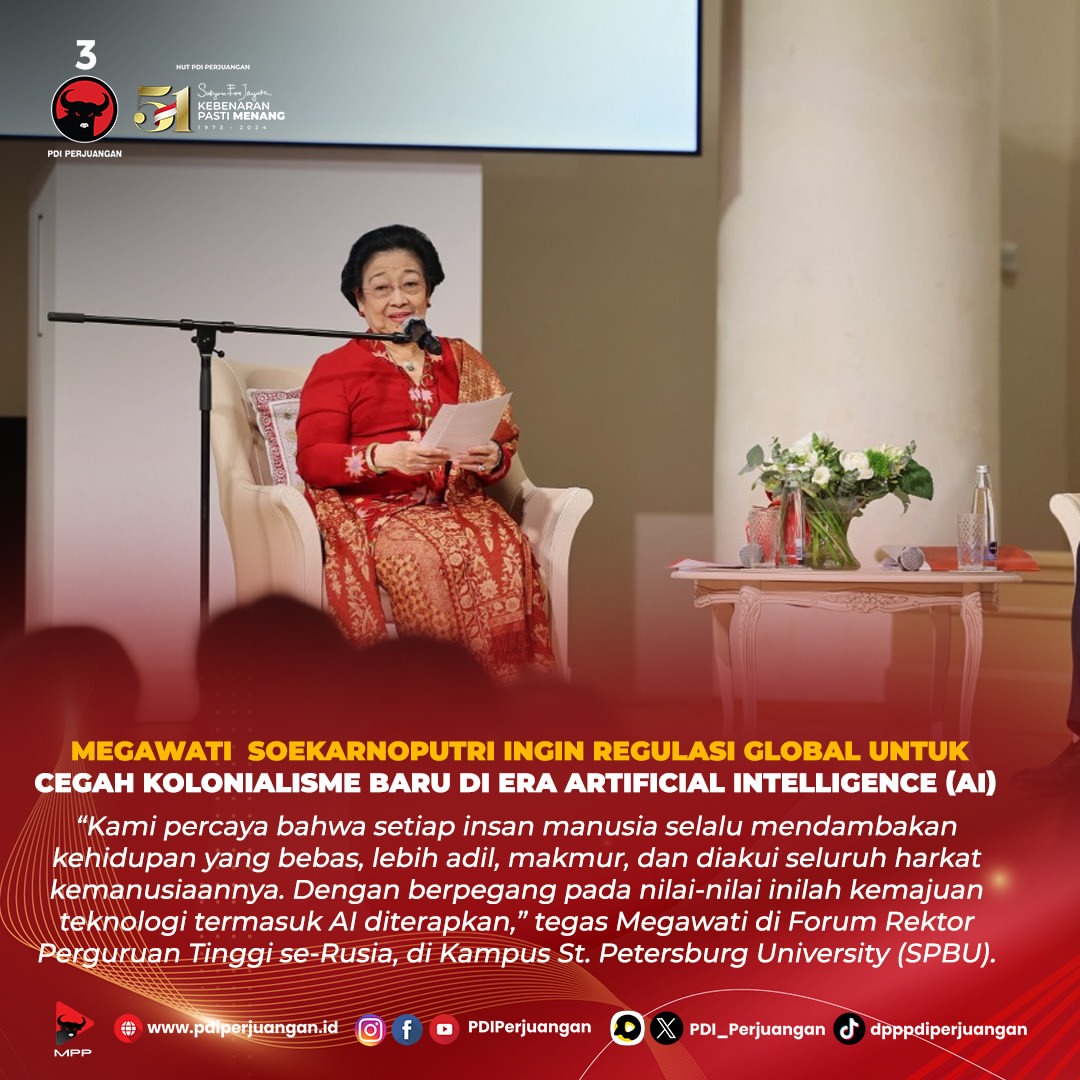 Megawati Soekarnoputri, Presiden Kelima Republik Indonesia, mengungkapkan pentingnya regulasi global untuk mencegah kolonialisme baru yang dapat muncul akibat perkembangan teknologi, khususnya kecerdasan buatan (AI). Pernyataan ini disampaikan dalam sebuah pidato pada Forum Rektor Perguruan Tinggi se-Rusia di St. Petersburg University, yang merayakan 300 tahun usia kampus tersebut.