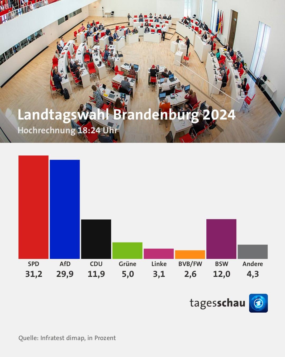 Hasil awal dari pemilihan umum di Brandenburg menunjukkan bahwa partai Sosial Demokrat (SPD) berada di posisi terdepan. Berdasarkan penghitungan suara sementara, SPD meraih 31,2 persen dari total suara yang masuk. Ini merupakan peningkatan yang signifikan, mengingat pesaing terdekatnya, Partai Alternatif untuk Jerman (AfD), hanya memperoleh 29,9 persen.