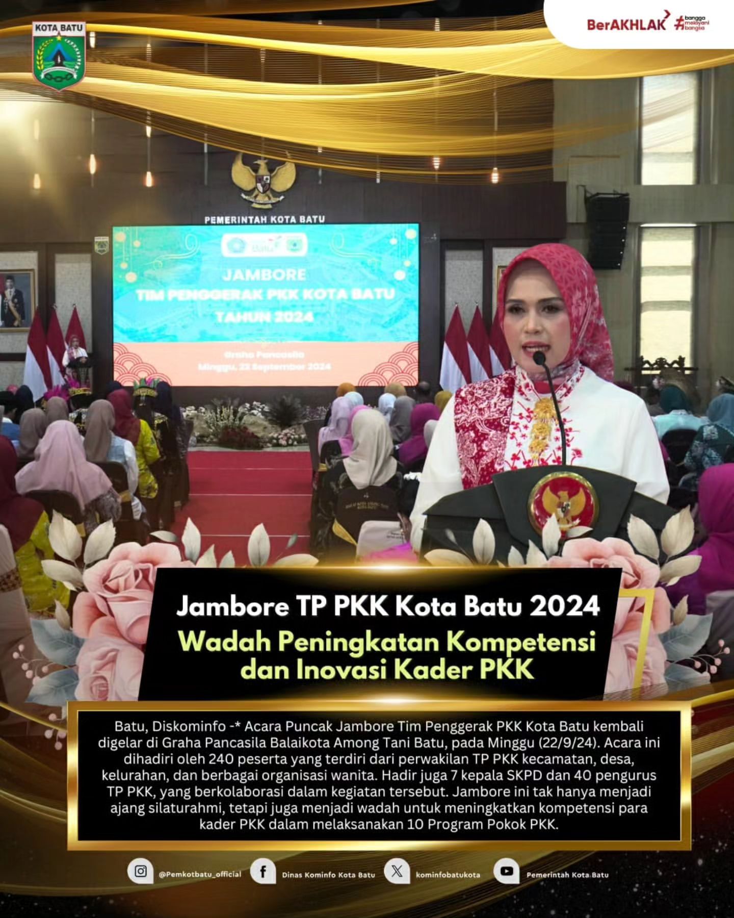 Jambore Tim Penggerak PKK Kota Batu 2024 kembali digelar di Graha Pancasila Balaikota Among Tani Batu pada hari Minggu, 22 September 2024. Acara ini dihadiri oleh 240 peserta yang terdiri dari perwakilan TP PKK dari kecamatan, desa, kelurahan, serta berbagai organisasi wanita.
