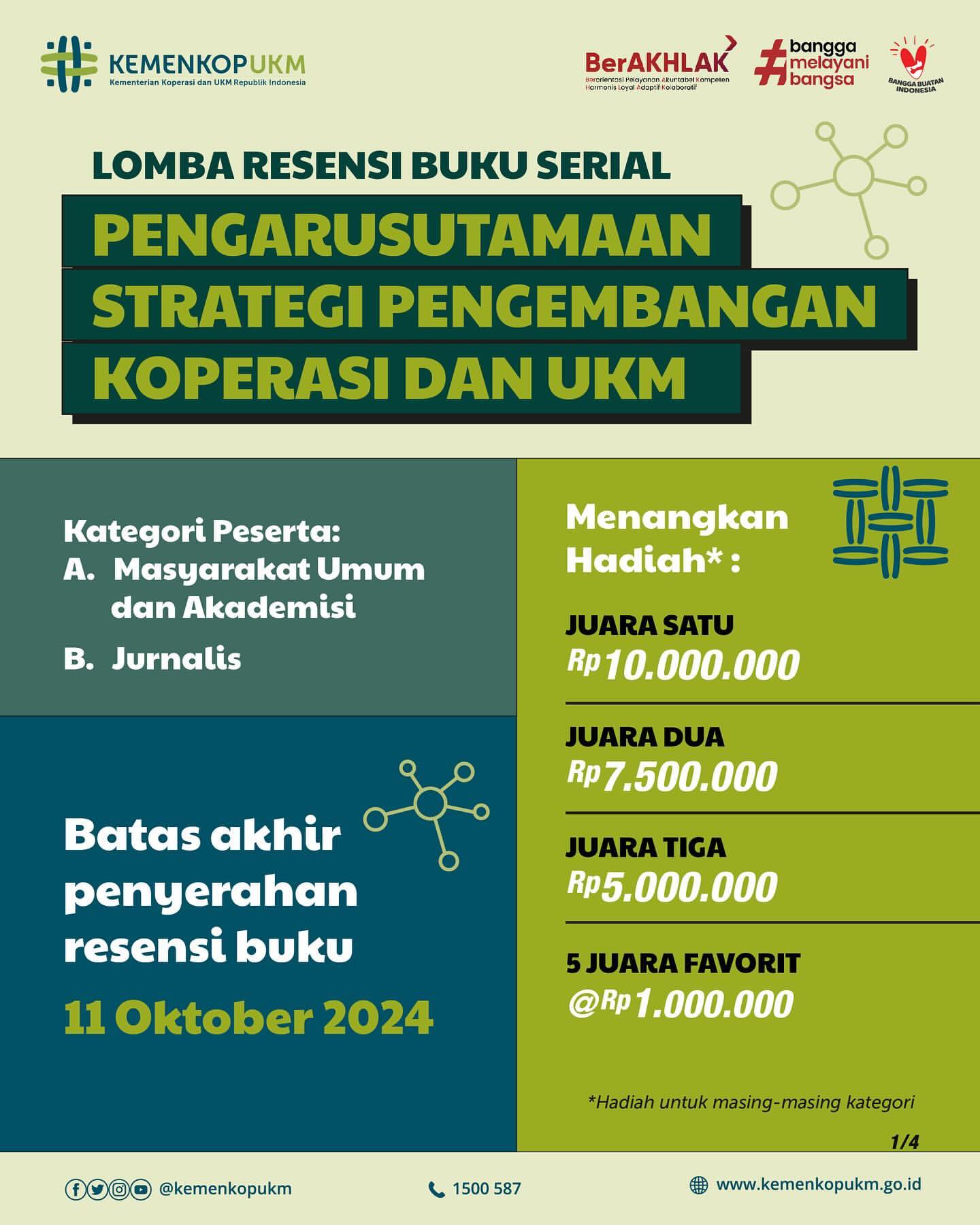 Kementerian Koperasi dan Usaha Kecil dan Menengah (KemenKopUKM) mengadakan Lomba Resensi Buku yang terbuka untuk masyarakat umum, akademisi, dan jurnalis. Lomba ini bertujuan untuk meningkatkan pemahaman tentang koperasi dan usaha kecil dan menengah (UKM) melalui tujuh buku yang telah disusun khusus. Buku-buku tersebut berjudul "Serial Pengarusutamaan Strategi Pengembangan Koperasi dan UKM" dan dapat diunduh secara gratis melalui tautan yang disediakan atau di website resmi KemenKopUKM.