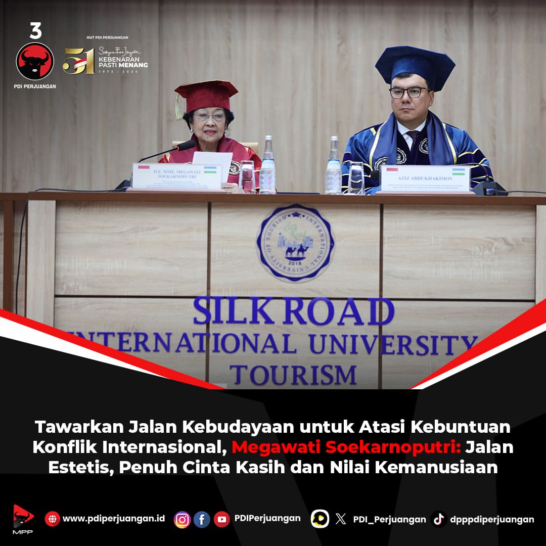 Presiden Kelima Republik Indonesia, Prof. Dr. (H.C.) Megawati Soekarnoputri, mengajak komunitas bangsa-bangsa di seluruh dunia untuk memilih jalan kebudayaan sebagai solusi untuk mengatasi kebuntuan konflik internasional. Ajakan ini disampaikan dalam orasi ilmiahnya di Samarkand pada hari Sabtu, 21 September 2024.