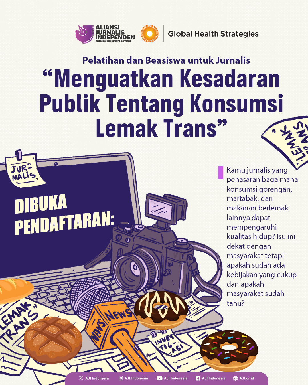 JAKARTA - Pelatihan dan beasiswa untuk jurnalis yang ingin meningkatkan kesadaran publik tentang konsumsi lemak trans kini dibuka. Inisiatif ini diharapkan dapat membantu jurnalis memahami lebih dalam mengenai dampak konsumsi makanan berlemak, seperti gorengan dan martabak, terhadap kesehatan masyarakat.