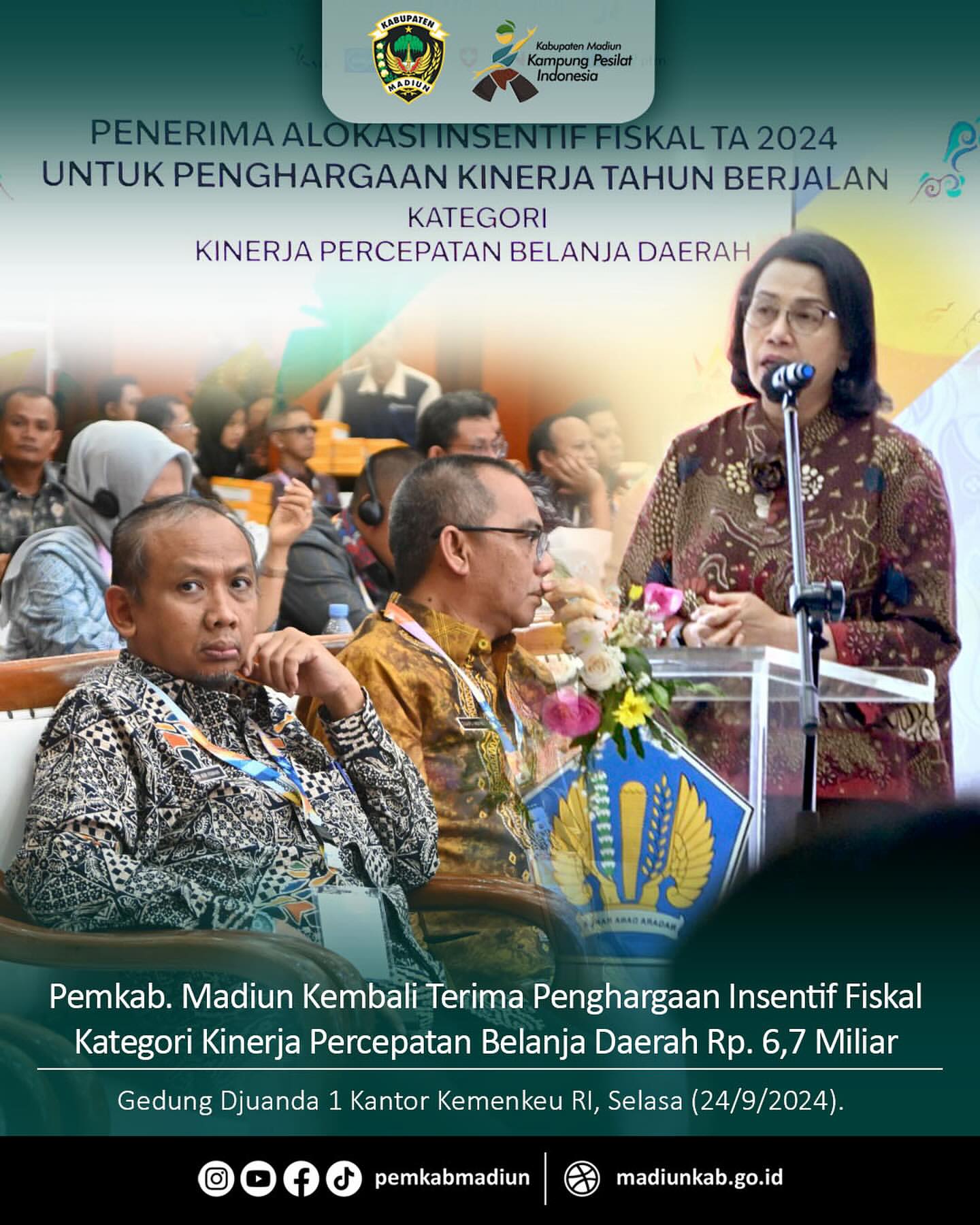Pemerintah Kabupaten Madiun baru saja menerima penghargaan Insentif Fiskal Kinerja Tahun Berjalan dari Kementerian Keuangan. Penghargaan ini diberikan dalam kategori Kinerja Percepatan Belanja Daerah, Penggunaan Produk Dalam Negeri (PDN), dan Insentif Desa untuk tahun 2024.