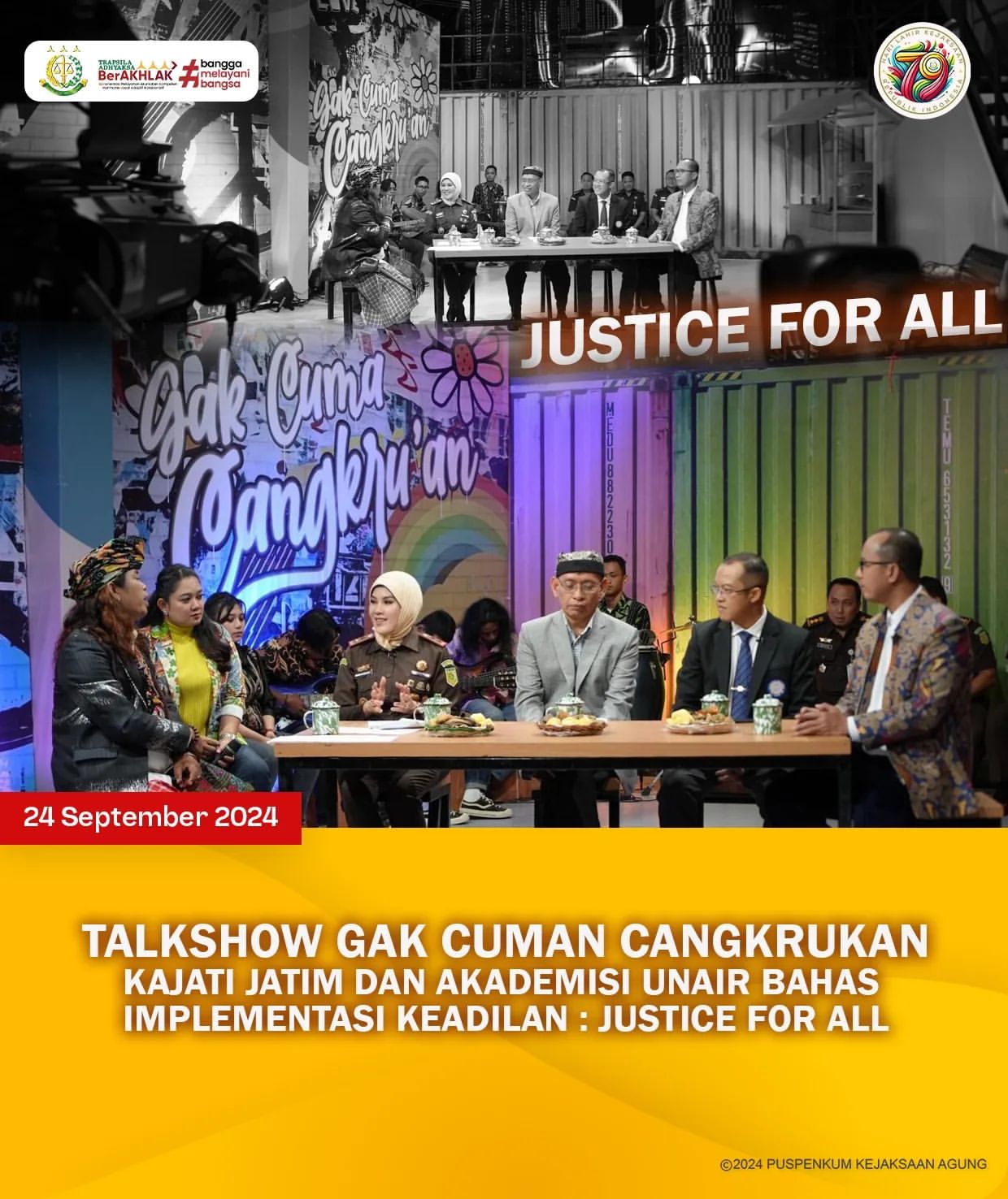 Pada hari Jumat, 20 September 2024, Kejaksaan Tinggi Jawa Timur (Kajati Jatim) mengadakan acara talkshow yang berjudul "Gak Cuman Cangkrukan" di stasiun televisi JTV Surabaya. Acara ini menghadirkan Dr. Mia Amiati, SH, MH, CMA, CSSL sebagai narasumber utama, bersama dengan beberapa tokoh pendidikan dari Universitas Airlangga (Unair).