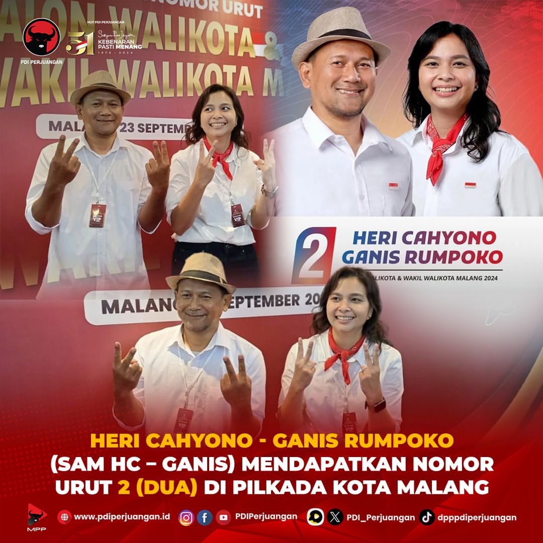 Pada hari Senin, 23 September 2024, pasangan calon Wali Kota dan Wakil Wali Kota Malang, Heri Cahyono dan Ganis Rumpoko, mendapatkan nomor urut 2 dalam pemilihan umum kepala daerah (Pilkada) Kota Malang. Pengundian nomor urut ini dilakukan oleh Komisi Pemilihan Umum (KPU) Kota Malang.