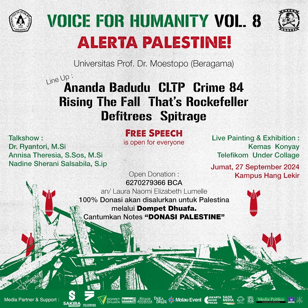 Jakarta, Indonesia – Pada tanggal yang akan datang, acara Voice for Humanity Vol.8 dengan tema "Alerta Palestine" akan digelar. Acara ini bertujuan untuk mengumpulkan dana dan memberikan dukungan bagi rakyat Palestina. Dalam rangkaian acara ini, akan ada konser amal, talkshow yang menggugah pemikiran, serta pameran lukisan secara langsung.