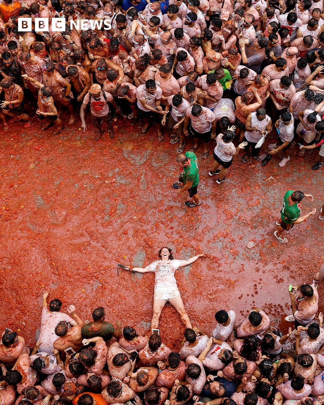 Festival La Tomatina, yang dikenal sebagai pertarungan tomat terbesar di dunia, kembali diselenggarakan di desa Buñol, dekat Valencia, Spanyol. Acara tahunan ini menarik perhatian orang-orang dari berbagai belahan dunia dan berlangsung pada tahun ini dengan jumlah peserta dibatasi hingga 22.000 orang.
