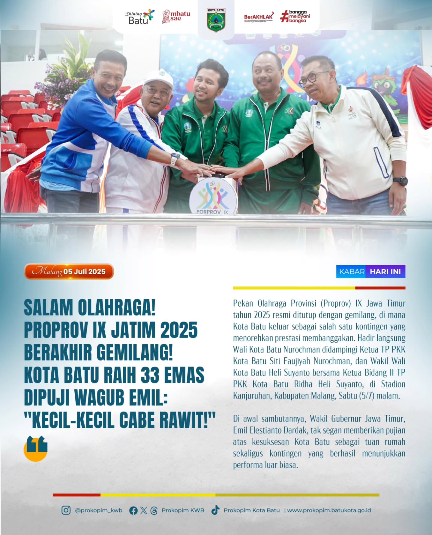 Prokopim, Malang – Pekan Olahraga Provinsi (Proprov) IX Jawa Timur tahun 2025 resmi ditutup dengan meriah, dan Kota Batu menjadi salah satu kontingen yang berhasil meraih prestasi yang sangat membanggakan. Upacara penutupan berlangsung di Stadion Kanjuruhan, Kabupaten Malang, pada Sabtu, 5 Juli 2025, dihadiri oleh Wali Kota Batu, Nurochman, serta jajaran lainnya.