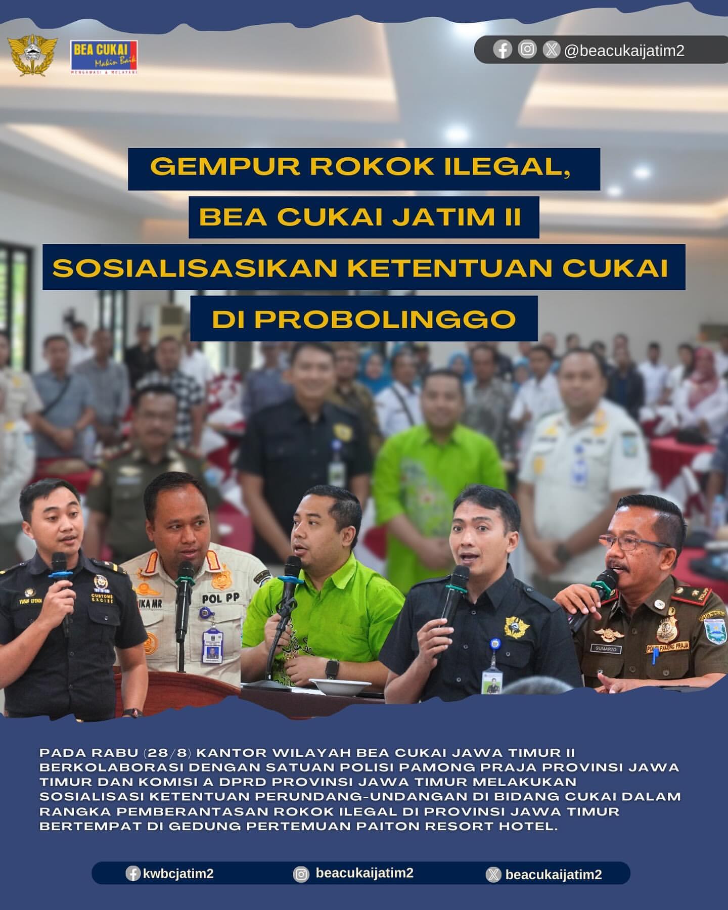 Pada Rabu, 28 Agustus 2023, Kantor Wilayah Bea Cukai Jawa Timur II mengadakan sosialisasi mengenai ketentuan perundang-undangan di bidang cukai. Acara ini berlangsung di Gedung Pertemuan Paiton Resort Hotel, Probolinggo. Sosialisasi ini merupakan hasil kolaborasi antara Bea Cukai Jatim II, Satuan Polisi Pamong Praja Provinsi Jawa Timur, dan Komisi A DPRD Provinsi Jawa Timur.