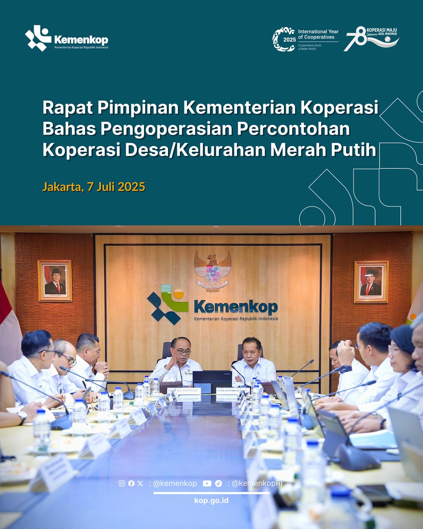 Jakarta, 7 Juli 2025 - Menteri Koperasi Budi Arie Setiadi, bersama Wakil Menteri Koperasi Ferry Juliantono, memimpin Rapat Pimpinan (Rapim) yang dihadiri oleh Eselon I dan II serta jajaran Kementerian Koperasi. Rapat ini dilaksanakan di Jakarta dan bertujuan untuk membahas percepatan penyelesaian proyek Percontohan Koperasi Desa/Kelurahan Merah Putih.