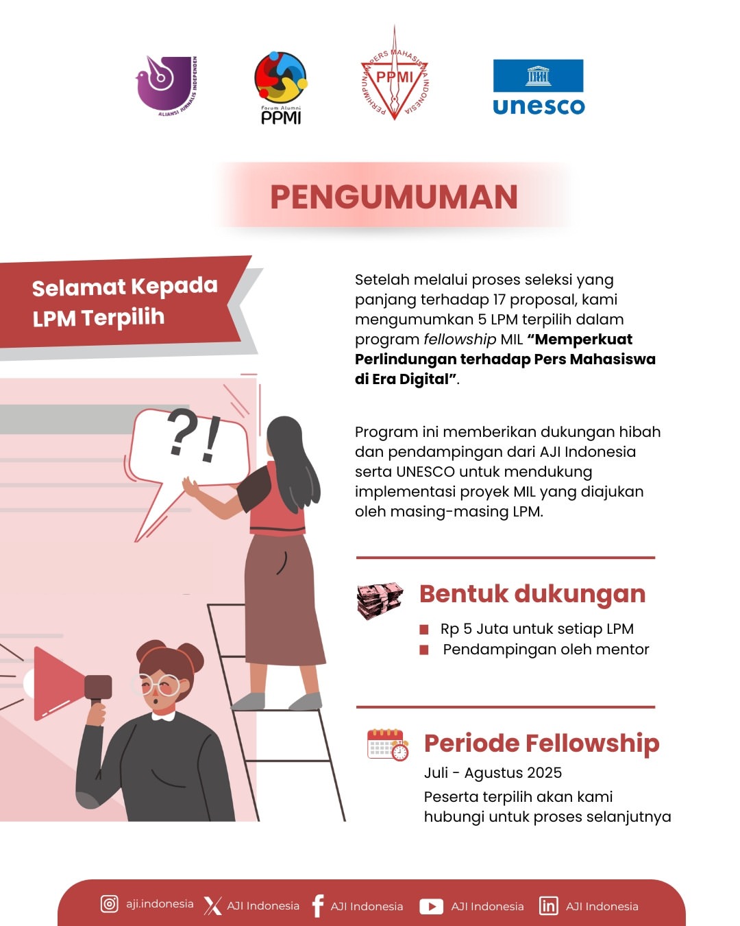 Selamat kepada lima Lembaga Pers Mahasiswa (LPM) yang telah terpilih untuk menerima fellowship MIL. Program ini diselenggarakan oleh Forum Alumni Aktivis Pers Mahasiswa Indonesia dan didukung oleh UNESCO, serta Aliansi Jurnalis Independen (AJI).
