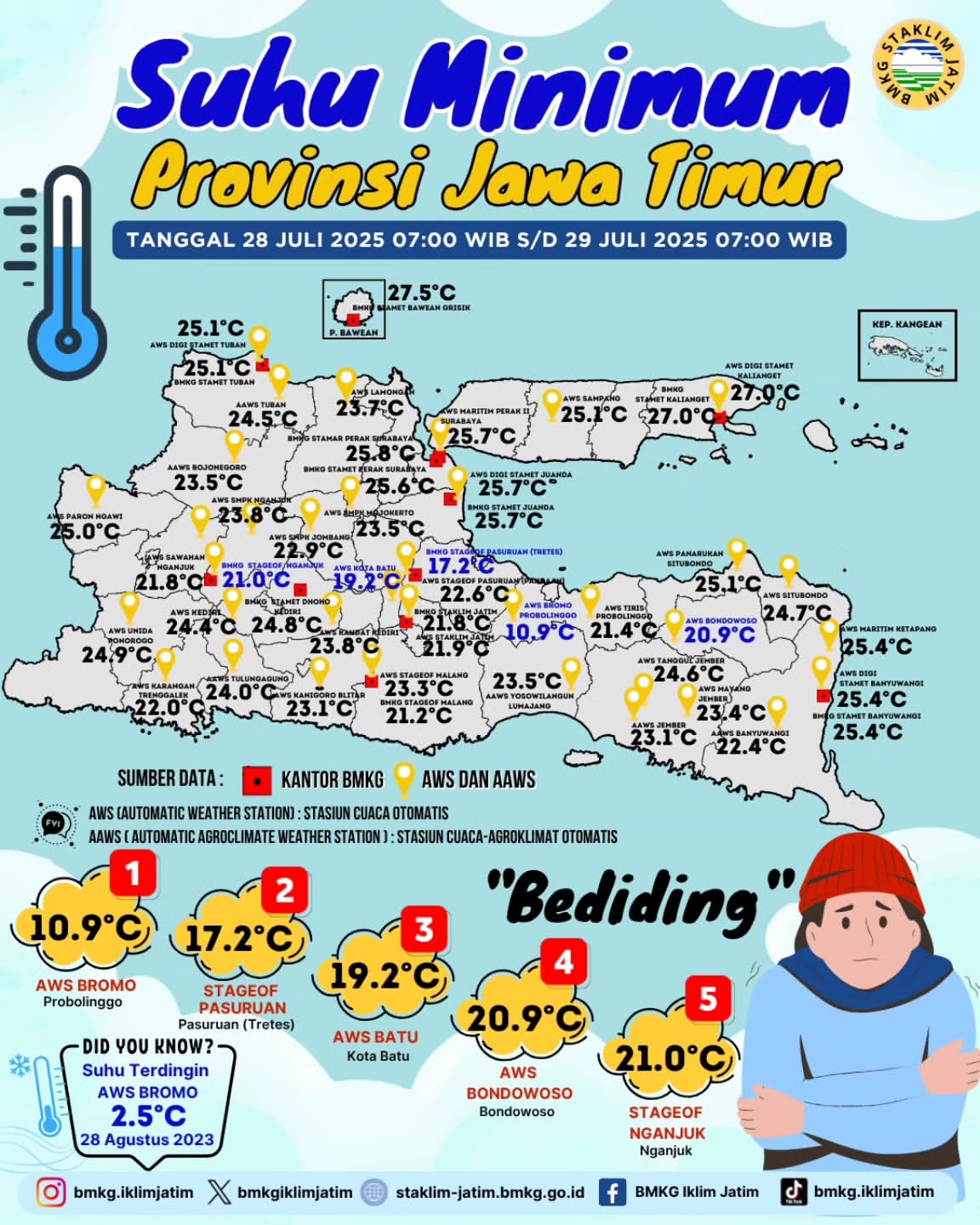Jawa Timur, 29 Juli 2025 - Pada tanggal 28 hingga 29 Juli 2025, suhu minimum di Provinsi Jawa Timur mengalami penurunan yang cukup signifikan. Data terbaru menunjukkan bahwa Probolinggo, khususnya di daerah yang dikenal dengan nama AWS BROMO, mencatat suhu terendah mencapai 10.9 derajat Celcius.