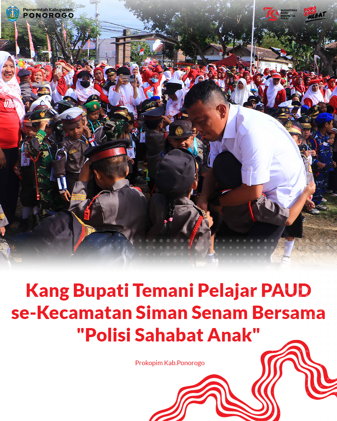 Suasana ceria dan penuh semangat terlihat ketika 1.664 peserta didik dari Playgroup dan TK berkumpul di Lapangan Kecamatan Siman, Kabupaten Ponorogo, pada Rabu, 28 Agustus 2024. Mereka didampingi oleh guru dan orang tua, merayakan peringatan Hari Ulang Tahun Republik Indonesia ke-79.