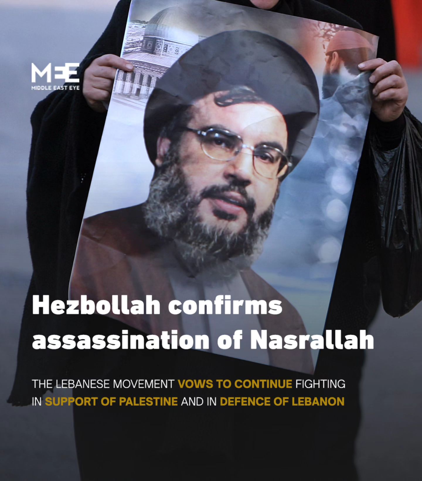 Hezbollah mengonfirmasi kematian Nasrallah dalam sebuah pernyataan yang dirilis pada hari Sabtu. Mereka menyebut Nasrallah sebagai "syahid di jalan menuju Yerusalem dan Palestina". Usia Nasrallah saat meninggal adalah 64 tahun.