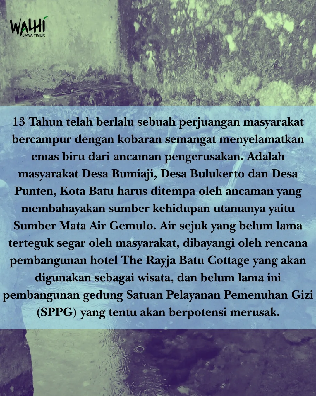 Di sebuah desa kecil bernama Gemulo, di kota Batu, masyarakat telah berjuang selama lebih dari tiga belas tahun untuk melindungi sumber mata air mereka. Sumber mata air ini sangat penting karena menjadi nadi kehidupan warga setempat, memberi mereka air bersih untuk kebutuhan sehari-hari. Sayangnya, sumber mata air ini terus diancam oleh rencana pembangunan yang bisa merusak lingkungan dan mengganggu keberlangsungan hidup mereka.