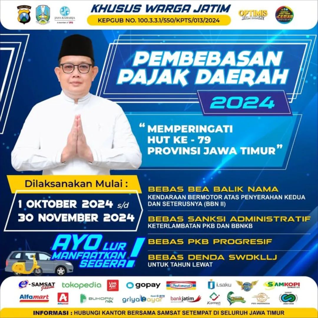 Pemerintah Provinsi Jawa Timur mengumumkan program pemutihan pajak kendaraan sebagai bagian dari perayaan Hari Ulang Tahun ke-79 Provinsi Jawa Timur. Program ini memberikan kesempatan bagi pemilik kendaraan bermotor untuk membayar pajak dengan lebih ringan.