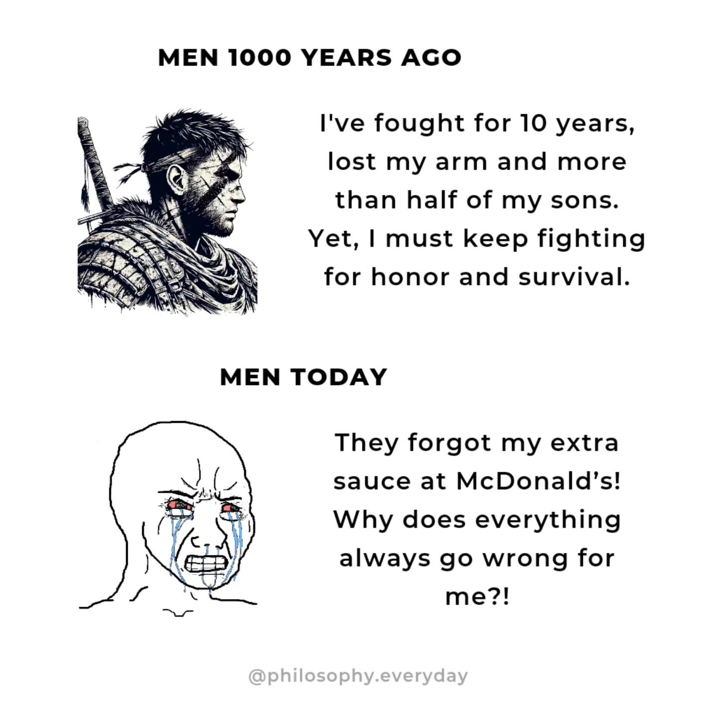 Sebuah meme tentang Wojak menggambarkan perasaan ini dengan lucu. Ini menunjukkan betapa kontrasnya kehidupan kita saat ini dengan perjuangan yang dihadapi nenek moyang kita. Pertanyaannya adalah: Apakah kita sudah terlalu nyaman? Apakah tantangan yang kita hadapi sekarang terasa sepele dibandingkan dengan apa yang harus dihadapi orang-orang di masa lalu?