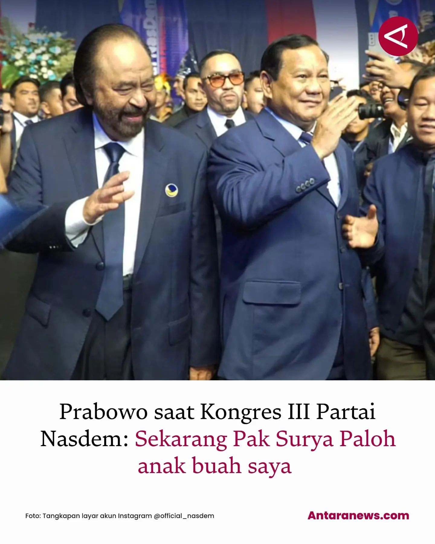 Di Kongres III Partai Nasdem, Presiden terpilih Prabowo Subianto mengungkapkan hubungan uniknya dengan Ketua Umum Partai Nasdem, Surya Paloh. Dalam pidatonya, Prabowo menjelaskan bahwa dulunya Surya Paloh adalah atasannya saat mereka bekerja di Partai Golkar, tetapi kini mereka memiliki hubungan yang berbeda.