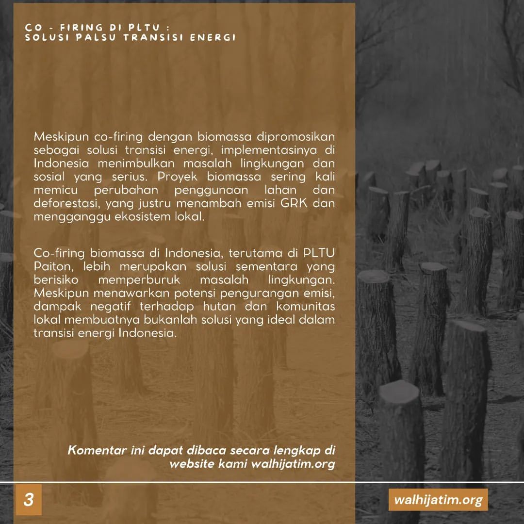 Meskipun diharapkan dapat menjadi solusi dalam transisi energi, co-firing dengan biomassa di Indonesia menghadapi banyak kritik. Co-firing adalah proses pembakaran biomassa bersamaan dengan bahan bakar fosil untuk menghasilkan energi. Namun, implementasi metode ini di Indonesia ternyata menimbulkan sejumlah masalah lingkungan dan sosial yang serius.