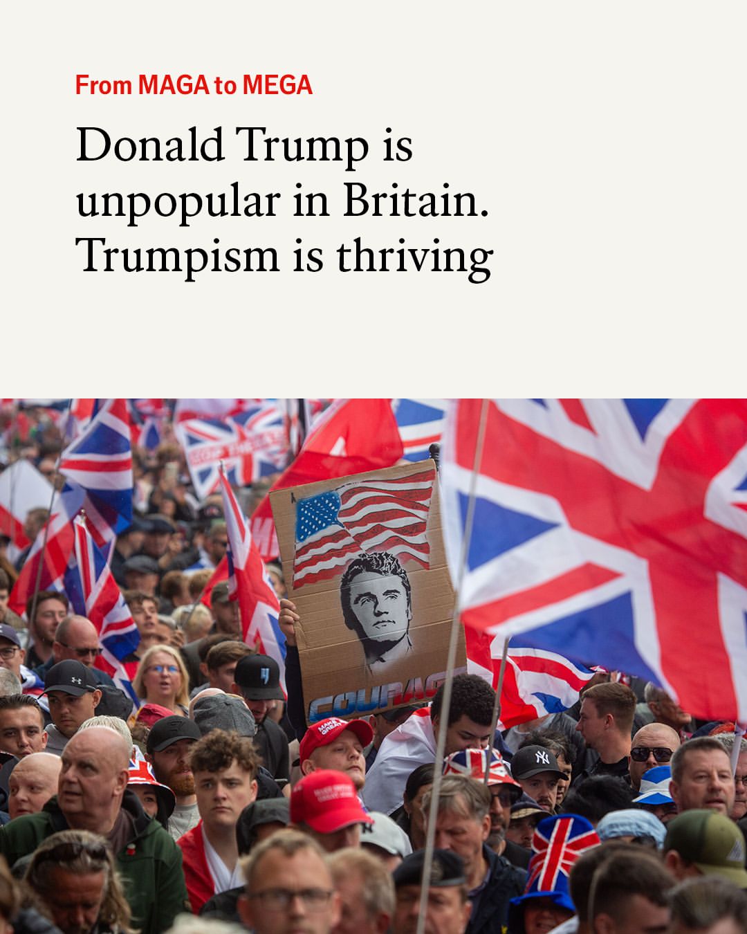 Uniknya, di kerumunan tersebut terlihat banyak topi bertuliskan berbagai slogan seperti MAGA, MEGA (Make England Great Again), dan MBGA (Make Britain Great Again). Ini menunjukkan adanya pengaruh dari gerakan politik yang berasal dari Amerika Serikat, khususnya dari pendukung Donald Trump. Bahkan, Elon Musk, CEO Tesla dan SpaceX, turut menyampaikan pesan melalui video yang disambut meriah oleh kerumunan.