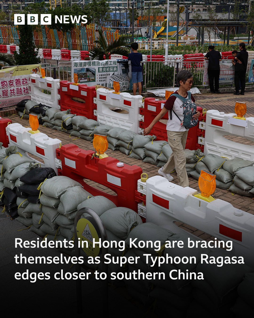 Pada Selasa malam, Hong Kong mengambil langkah-langkah besar untuk mengantisipasi datangnya Super Typhoon Ragasa, badai terkuat yang pernah melanda tahun ini. Kota ini menutup sekolah-sekolah dan menutup sebagian besar bandara agar penduduk dan pelancong tetap aman. Selain itu, toko-toko di seluruh kota juga menutup sementara dan para pemilik toko menaruh karung pasir di depan toko mereka sebagai langkah pencegahan terhadap kemungkinan banjir dan kerusakan.