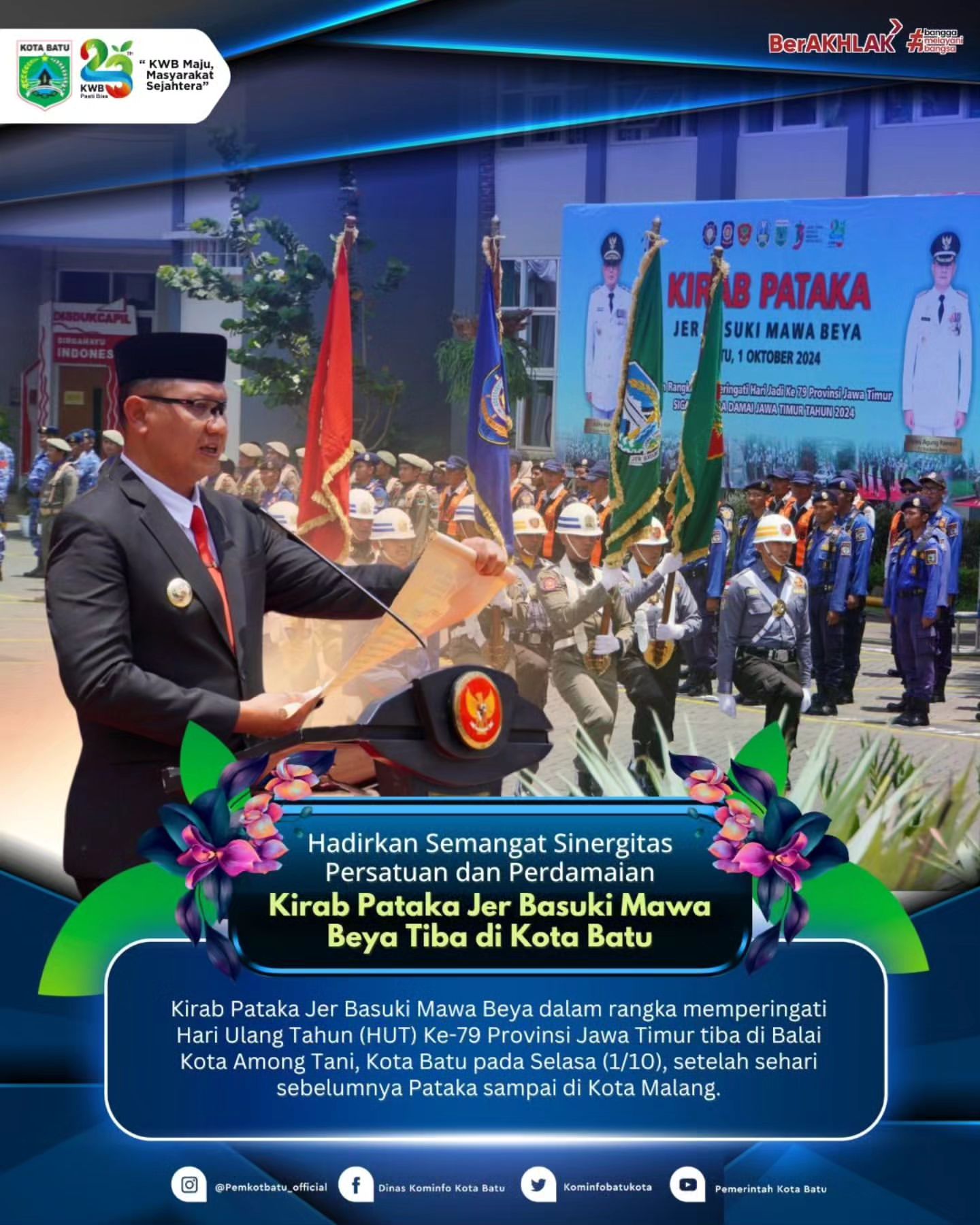 Kota Batu, Selasa (1/10) - Kirab Pataka Jer Basuki Mawa Beya dalam rangka memperingati Hari Ulang Tahun (HUT) Ke-79 Provinsi Jawa Timur telah tiba di Balai Kota Among Tani. Kirab ini tiba setelah sehari sebelumnya sampai di Kota Malang.