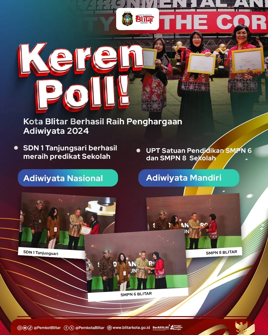 Kota Blitar berhasil meraih penghargaan Adiwiyata yang diselenggarakan oleh Kementerian Lingkungan Hidup di Jakarta pada hari Rabu, 2 Oktober. Penghargaan ini diberikan kepada tiga sekolah di Kota Blitar, yaitu SMPN 6 dan SMPN 8 yang mendapatkan kategori Sekolah Adiwiyata Mandiri, serta SDN 1 Tanjungsari yang meraih kategori Sekolah Adiwiyata Nasional.