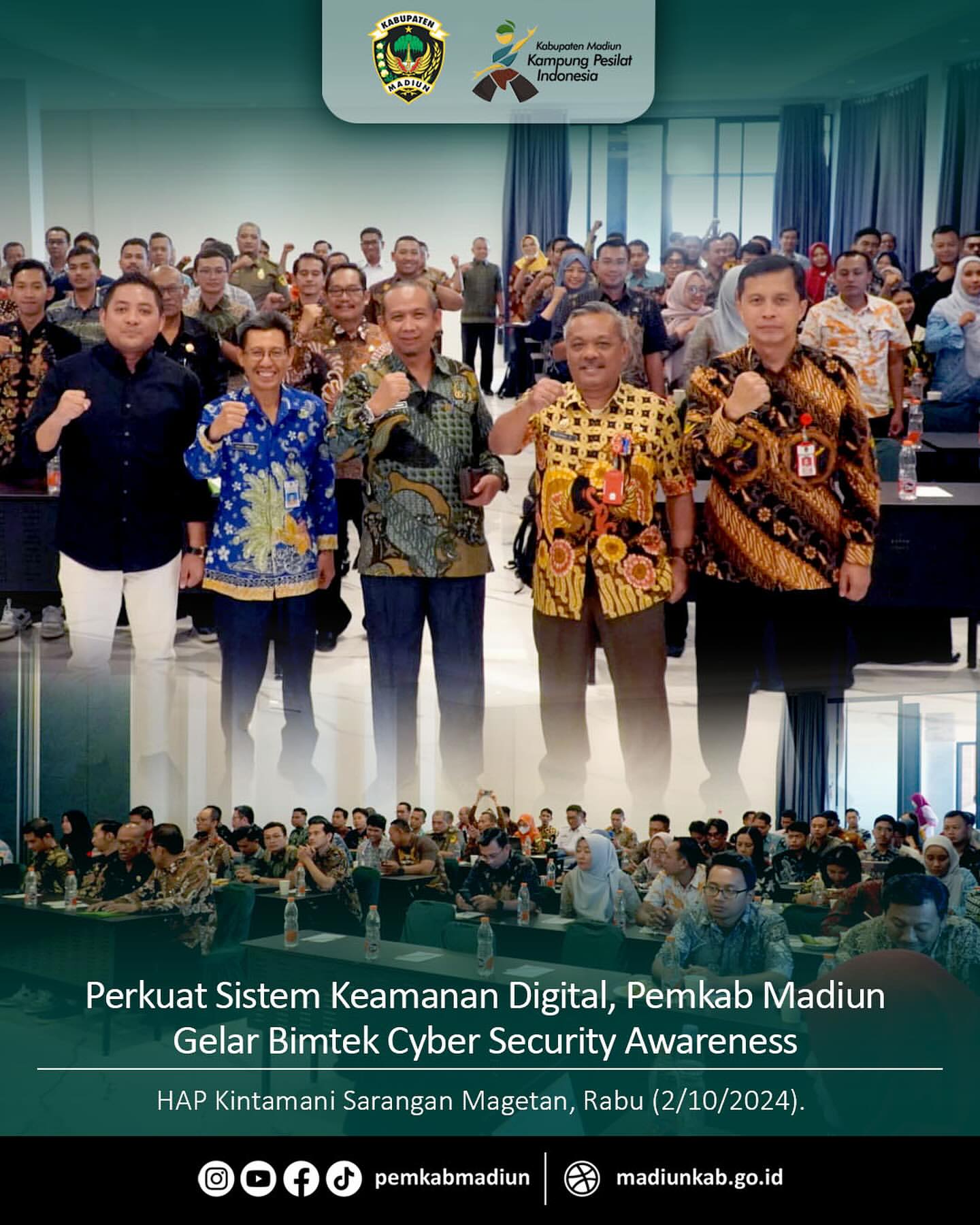Pemerintah Kabupaten Madiun mengadakan Bimbingan Teknis (Bimtek) Cyber Security Awareness pada Rabu, 2 Oktober 2024, di Magetan. Kegiatan ini bertujuan untuk meningkatkan sistem pengamanan, penanggulangan, dan pemulihan terhadap ancaman serta serangan yang dapat mengganggu Sistem Pemerintahan Berbasis Elektronik (SPBE).