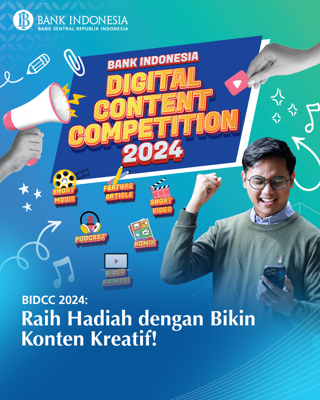 Bank Indonesia kembali mengadakan kompetisi konten digital yang menarik, yaitu Bank Indonesia Digital Content Competition (BIDCC) 2024. Kompetisi ini memberikan kesempatan bagi anak muda dan kreator konten untuk menampilkan ide-ide kreatif mereka. Dengan tema "Rupiah Berdaulat, Rupiah Berjaya", peserta diundang untuk membuat konten yang dapat mendidik masyarakat mengenai pentingnya nilai dan penggunaan rupiah.