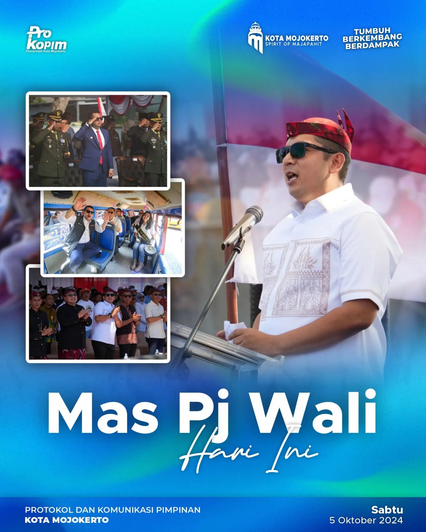 Mojokerto, 5 Oktober 2024 – Penjabat (Pj) Wali Kota Mojokerto, Moh. Ali Kuncoro, menghadiri acara Kirab Maskot yang digelar dalam rangka Pemilihan Kepala Daerah (PILKADA) Serentak tahun 2024. Acara tersebut berlangsung di Lapangan Raden Wijaya, yang terletak di Jalan Surodinawan No. 74, Prajurit Kulon, Kota Mojokerto.