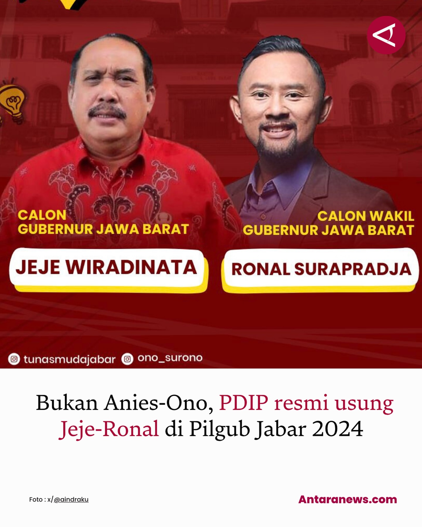PDI Perjuangan telah mengumumkan pasangan calon gubernur dan wakil gubernur Provinsi Jawa Barat untuk pemilihan umum yang akan datang. Pasangan yang diusung adalah Jeje Wiradinata dan Ronal Surapradja. Keputusan ini menjadi sorotan banyak pihak, terutama menjelang Pemilihan Umum Gubernur dan Wakil Gubernur Jabar tahun 2023.